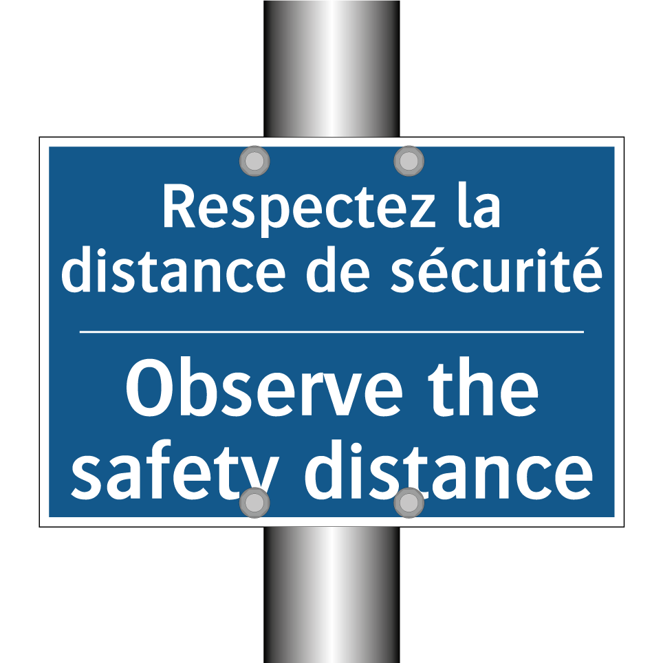 Panneau d'obligation bilingue avec texte en français : "Respectez la distance de sécurité", et en anglais : "Observe the safety distance"