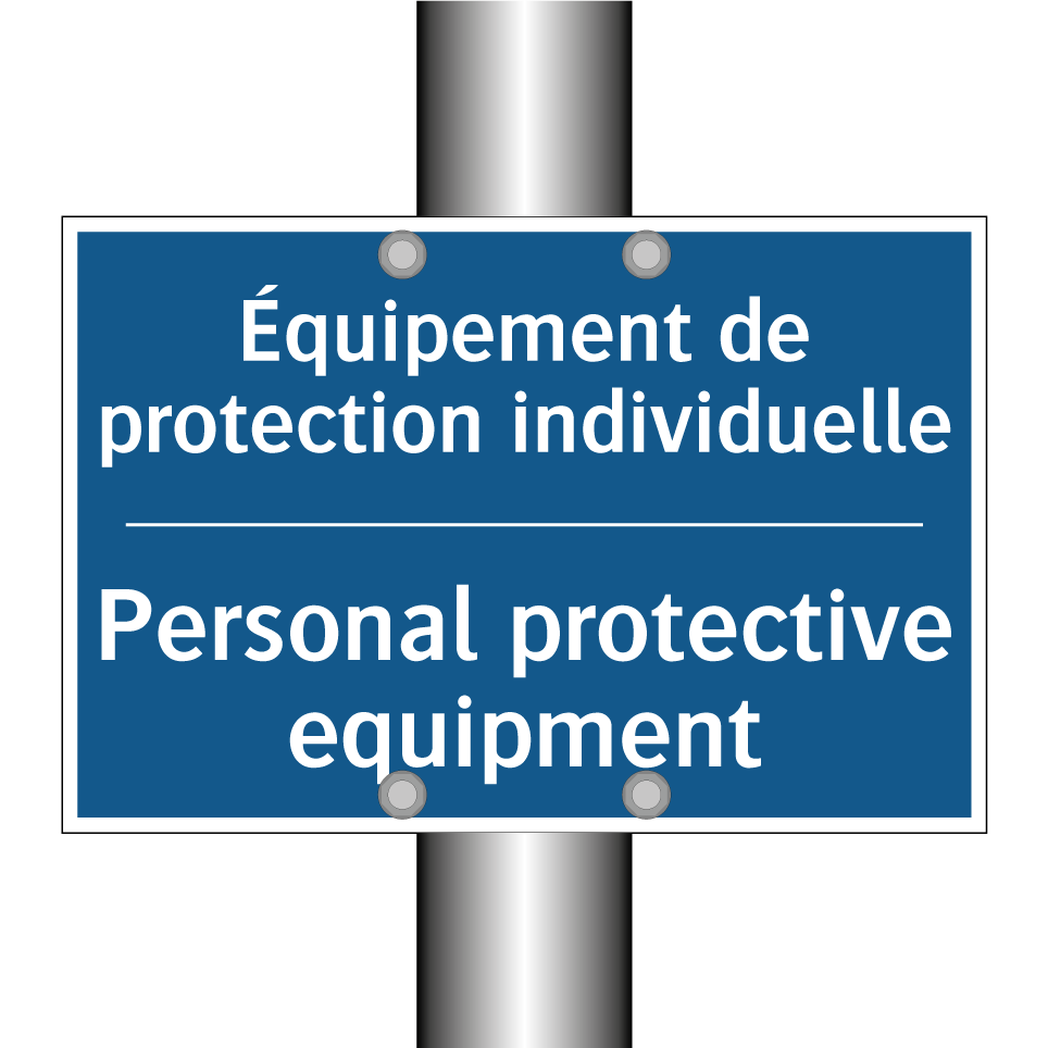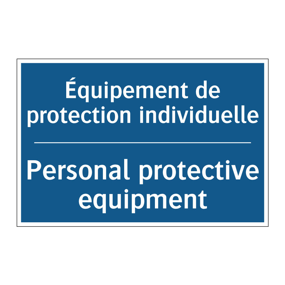 Panneau d'obligation bilingue avec texte en français : "Équipement de protection individuelle", et en anglais : "Personal protective equipment"