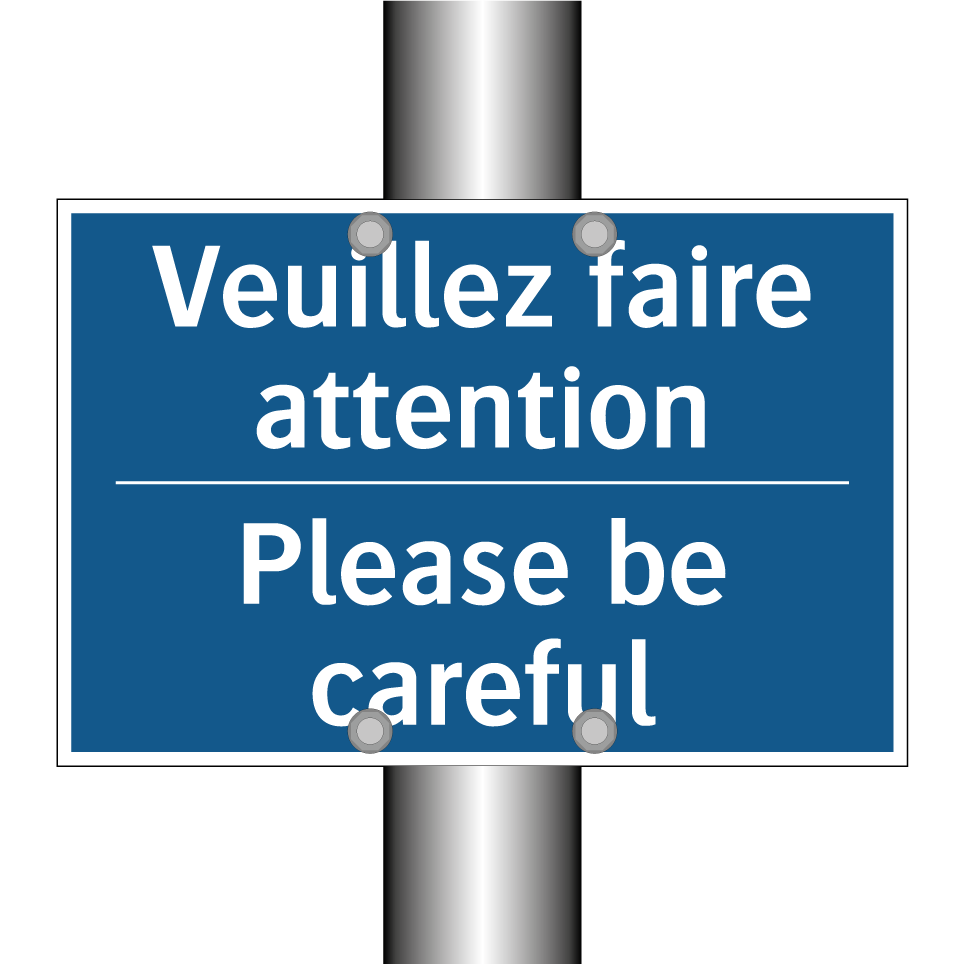Panneau d'obligation bilingue avec texte en français : "Veuillez faire attention", et en anglais : "Please be careful"