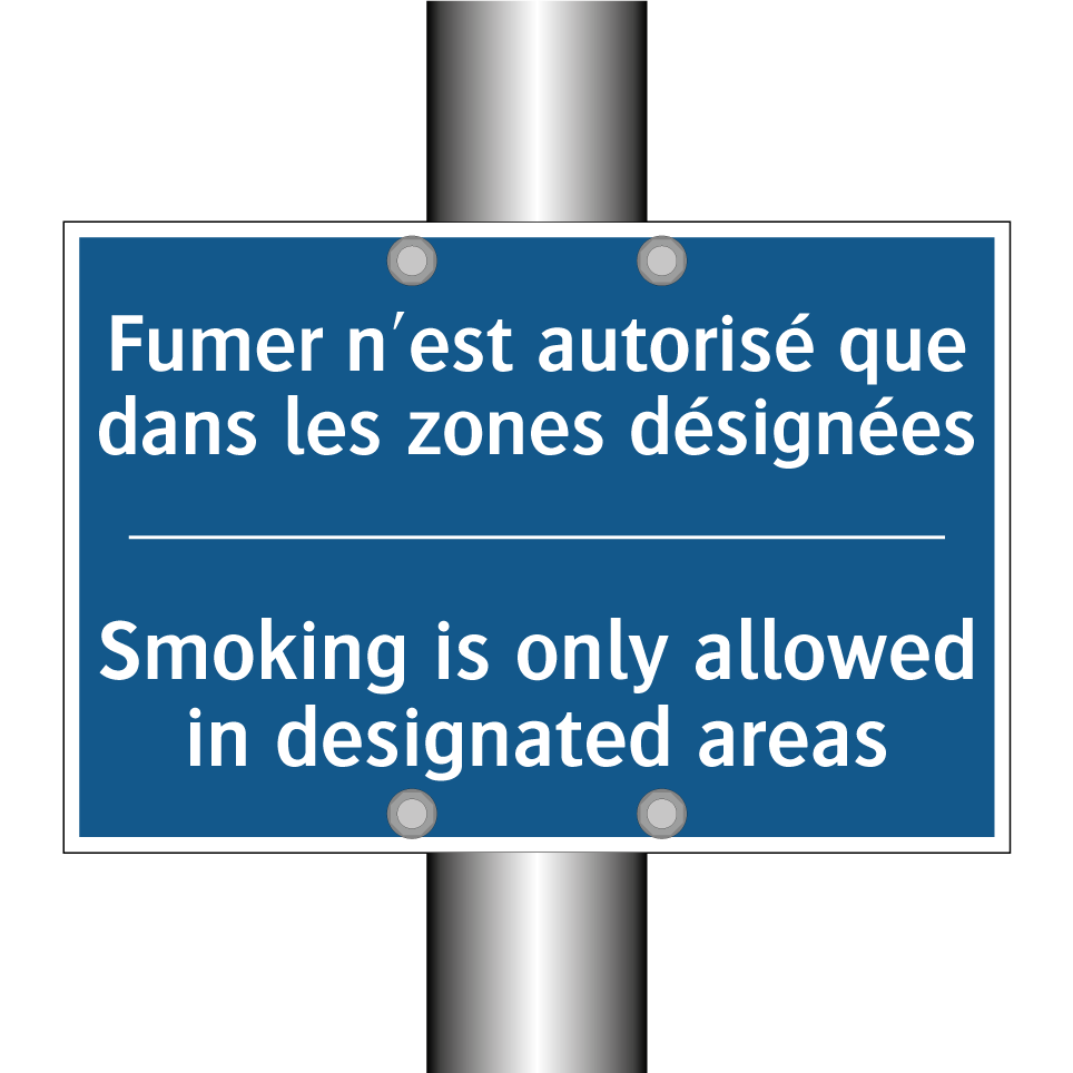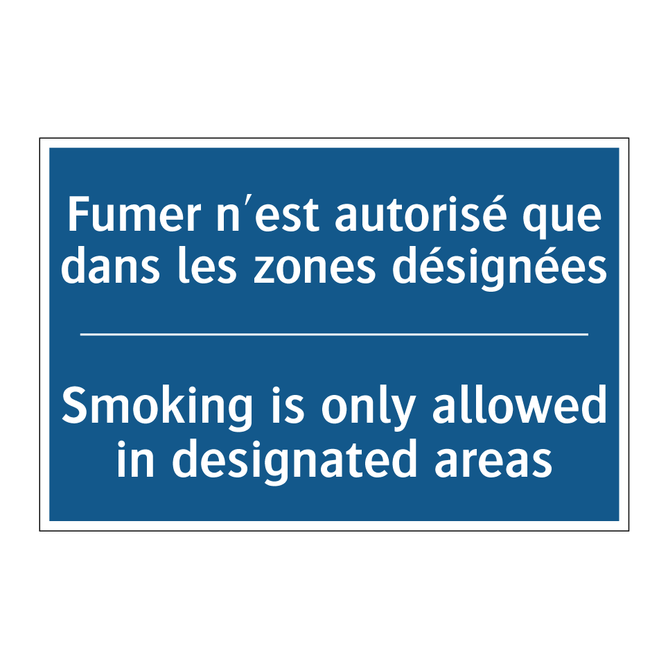 Panneau d'obligation bilingue avec texte en français : "Fumer n'est autorisé que dans les zones désignées", et en anglais : "Smoking is only allowed in designated areas"