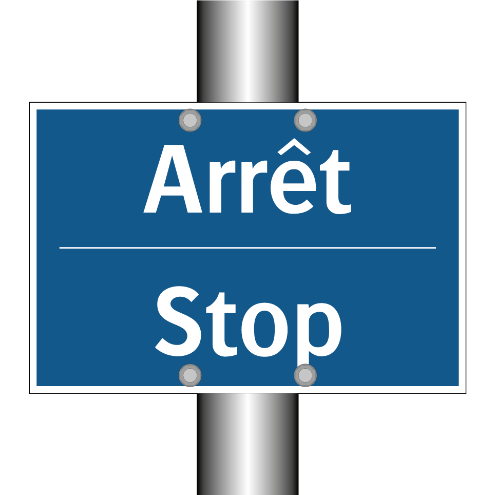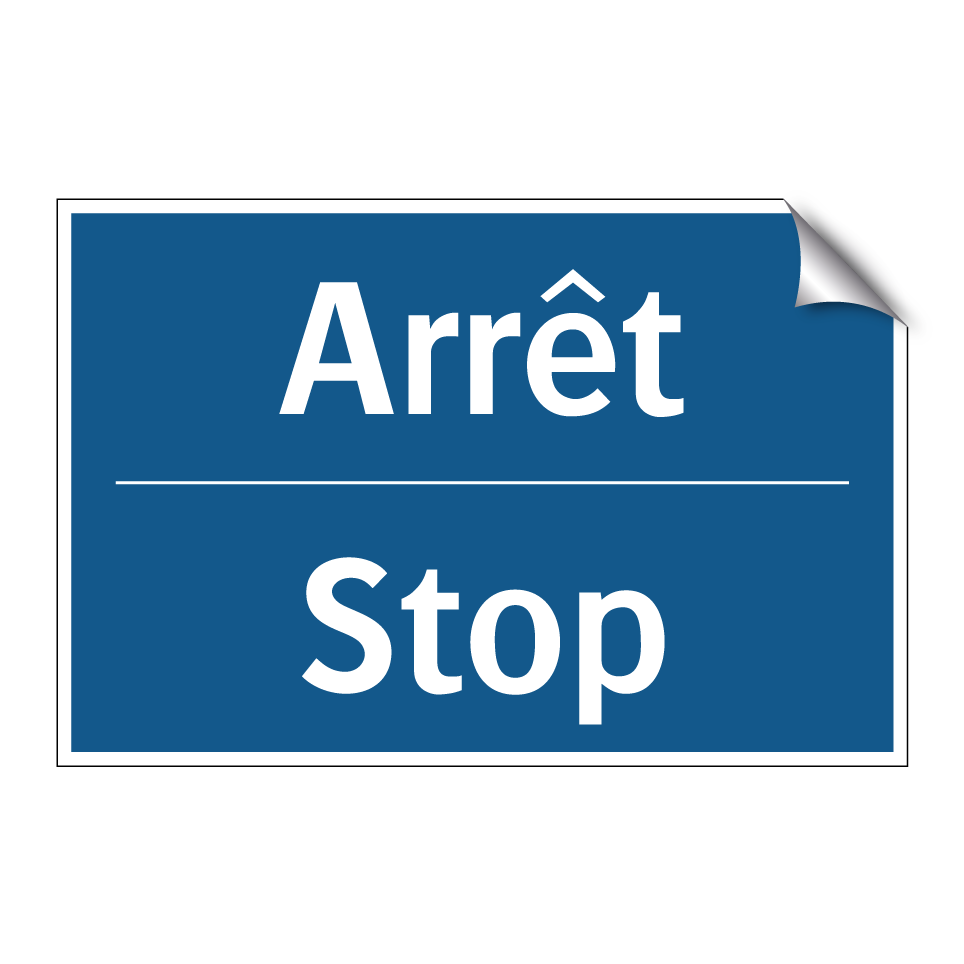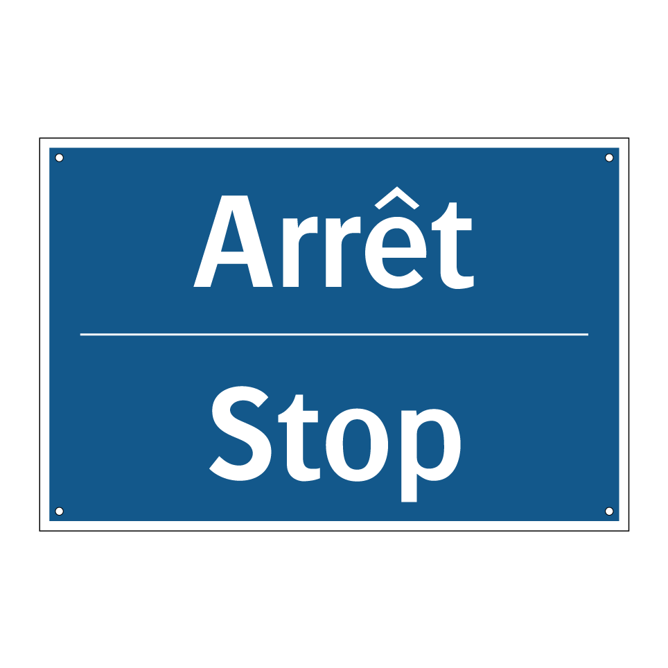 Panneau d'obligation bilingue avec texte en français : "Arrêt", et en anglais : "Stop"