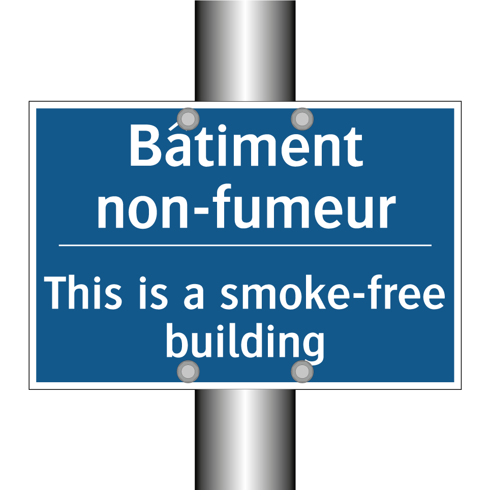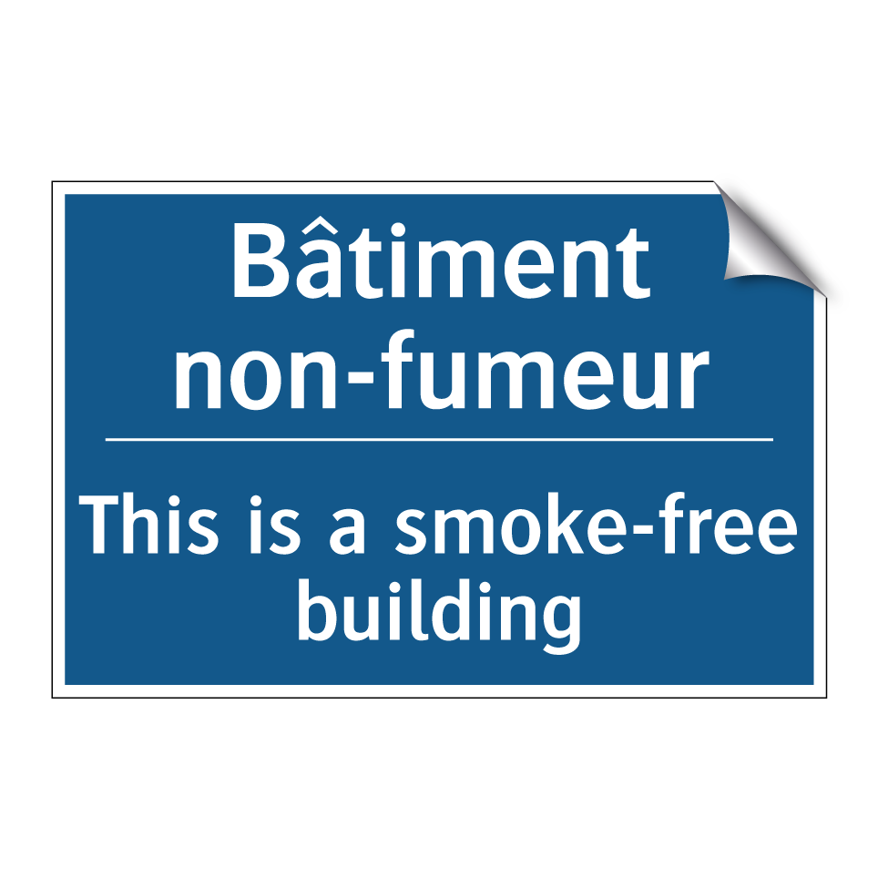 Panneau d'obligation bilingue avec texte en français : "Bâtiment non-fumeur", et en anglais : "This is a smoke-free building"