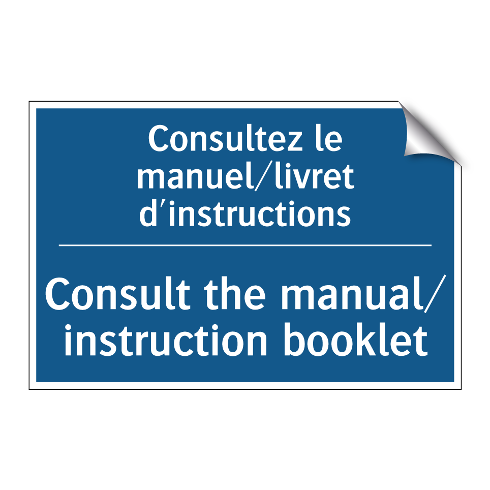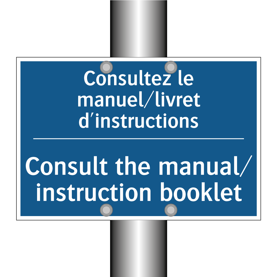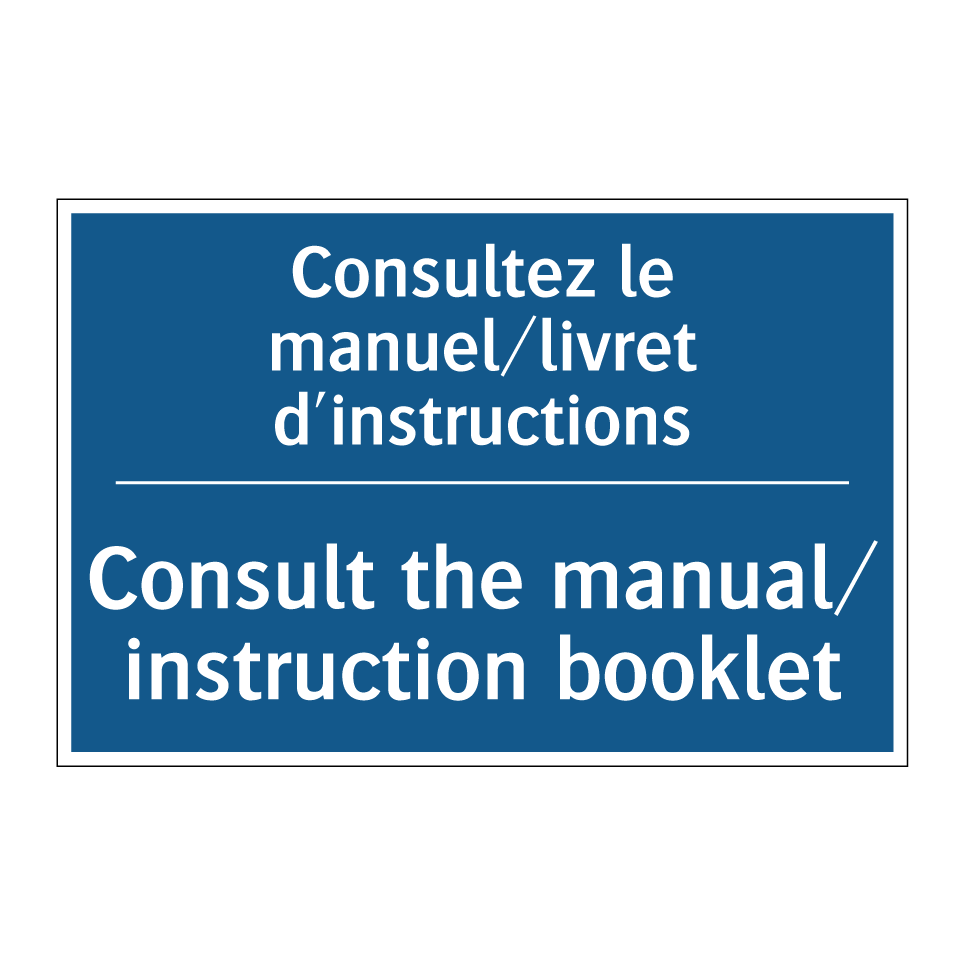 Panneau d'obligation bilingue avec texte en français : "Consultez le manuel/livret d'instructions", et en anglais : "Consult the manual/ instruction booklet"