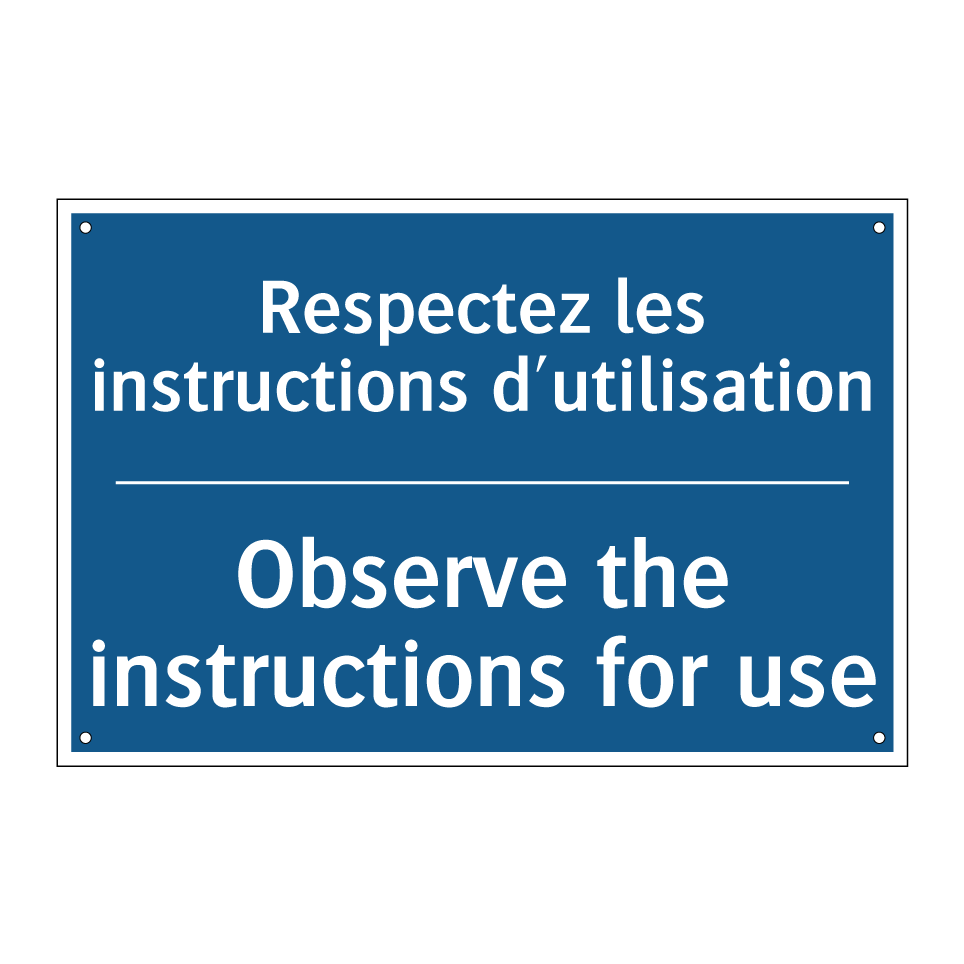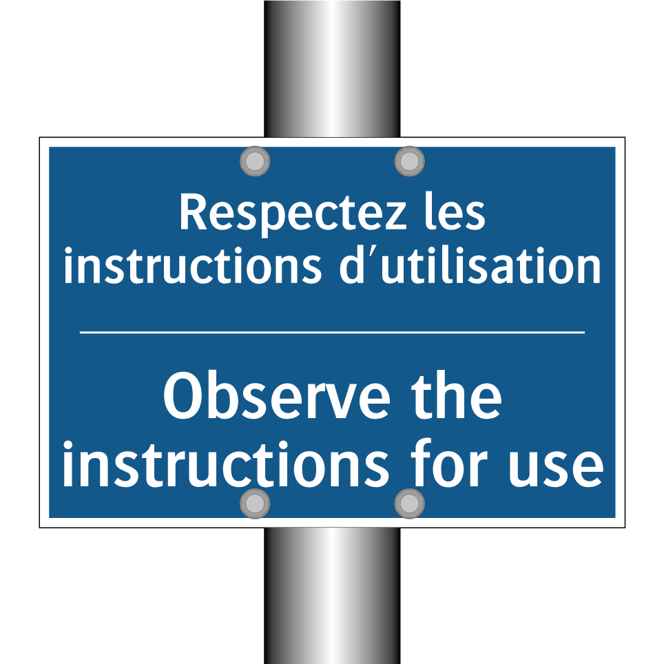 Panneau d'obligation bilingue avec texte en français : "Respectez les instructions d'utilisation", et en anglais : "Observe the instructions for use"