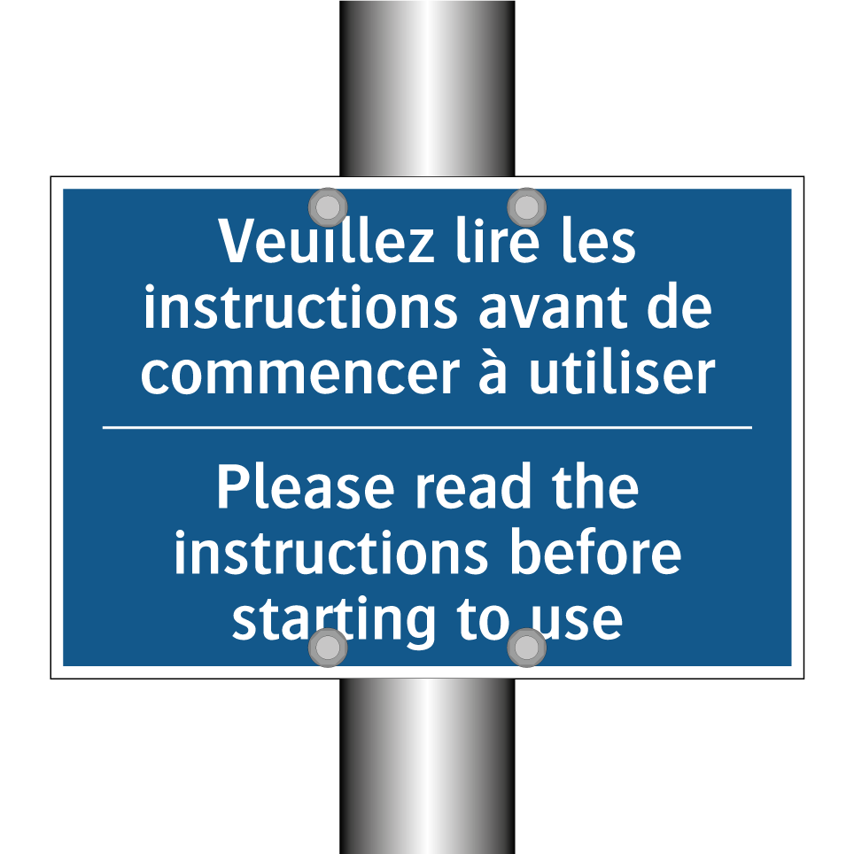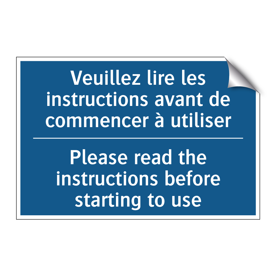 Panneau d'obligation bilingue avec texte en français : "Veuillez lire les instructions avant de commencer à utiliser", et en anglais : "Please read the instructions before starting to use"