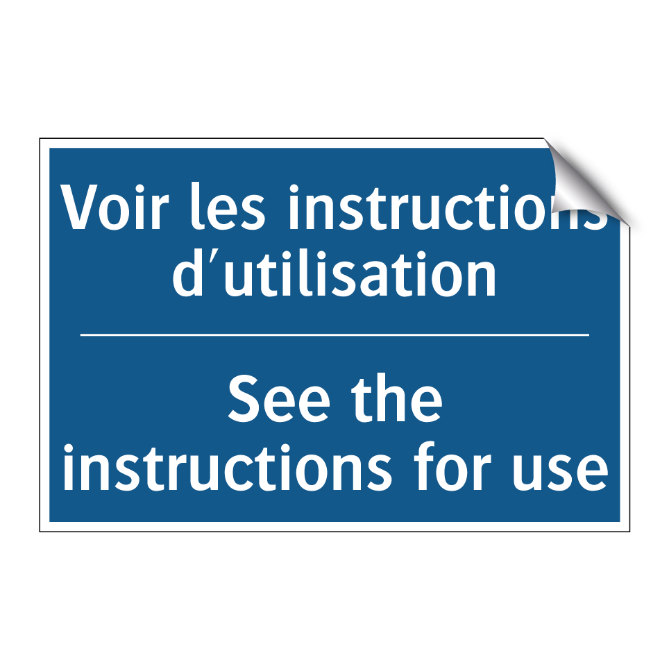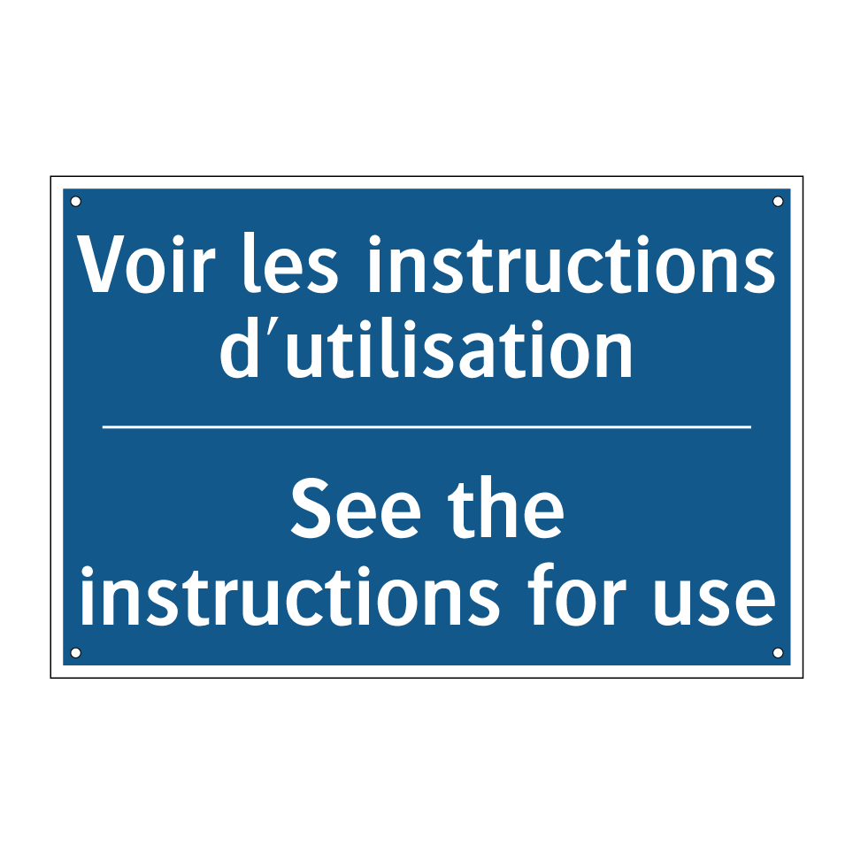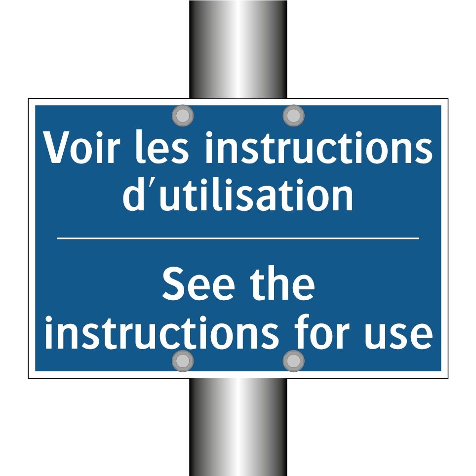 Panneau d'obligation bilingue avec texte en français : "Voir les instructions d'utilisation", et en anglais : "See the instructions for use"