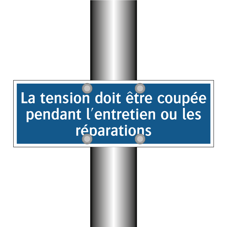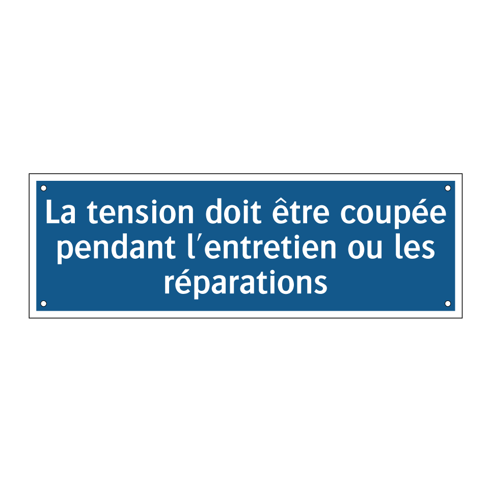 Panneau d'obligation avec le texte : "La tension doit être coupée pendant l'entretien ou les réparations"