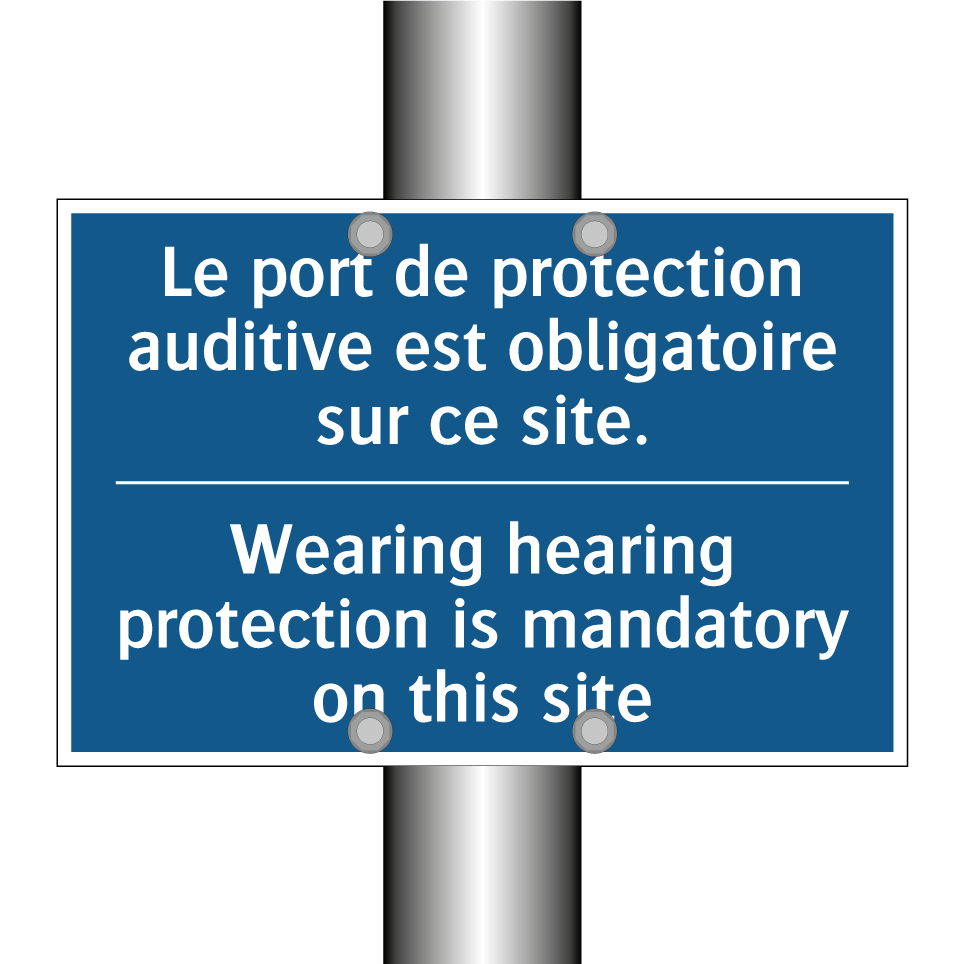 Panneau d'obligation bilingue avec texte en français : "Le port de protection auditive est obligatoire sur ce site.", et en anglais : "Wearing hearing protection is mandatory on this site"