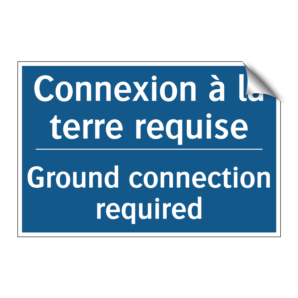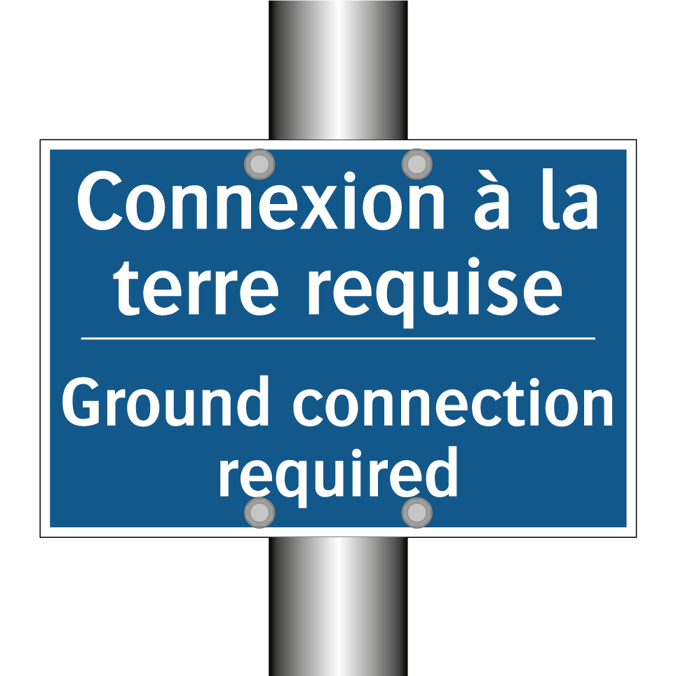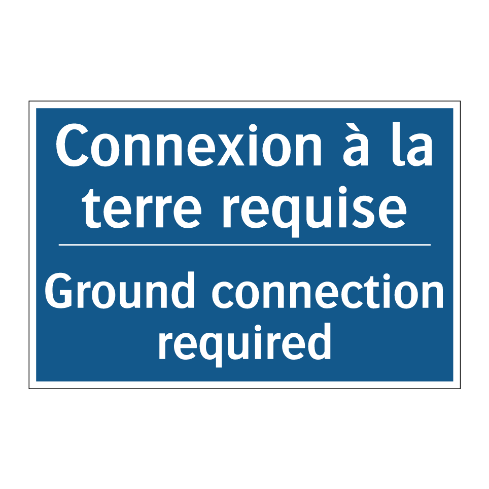 Panneau d'obligation bilingue avec texte en français : "Connexion à la terre requise", et en anglais : "Ground connection required"