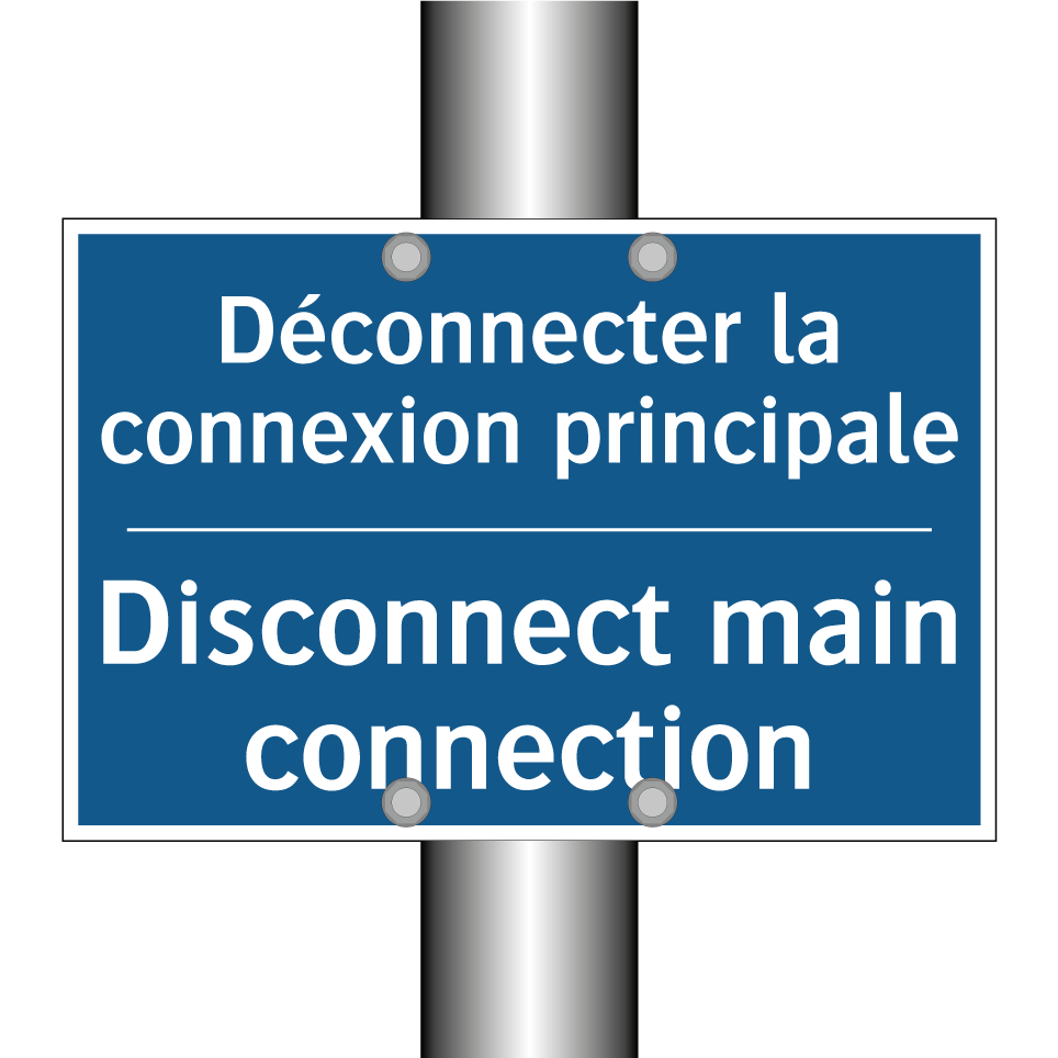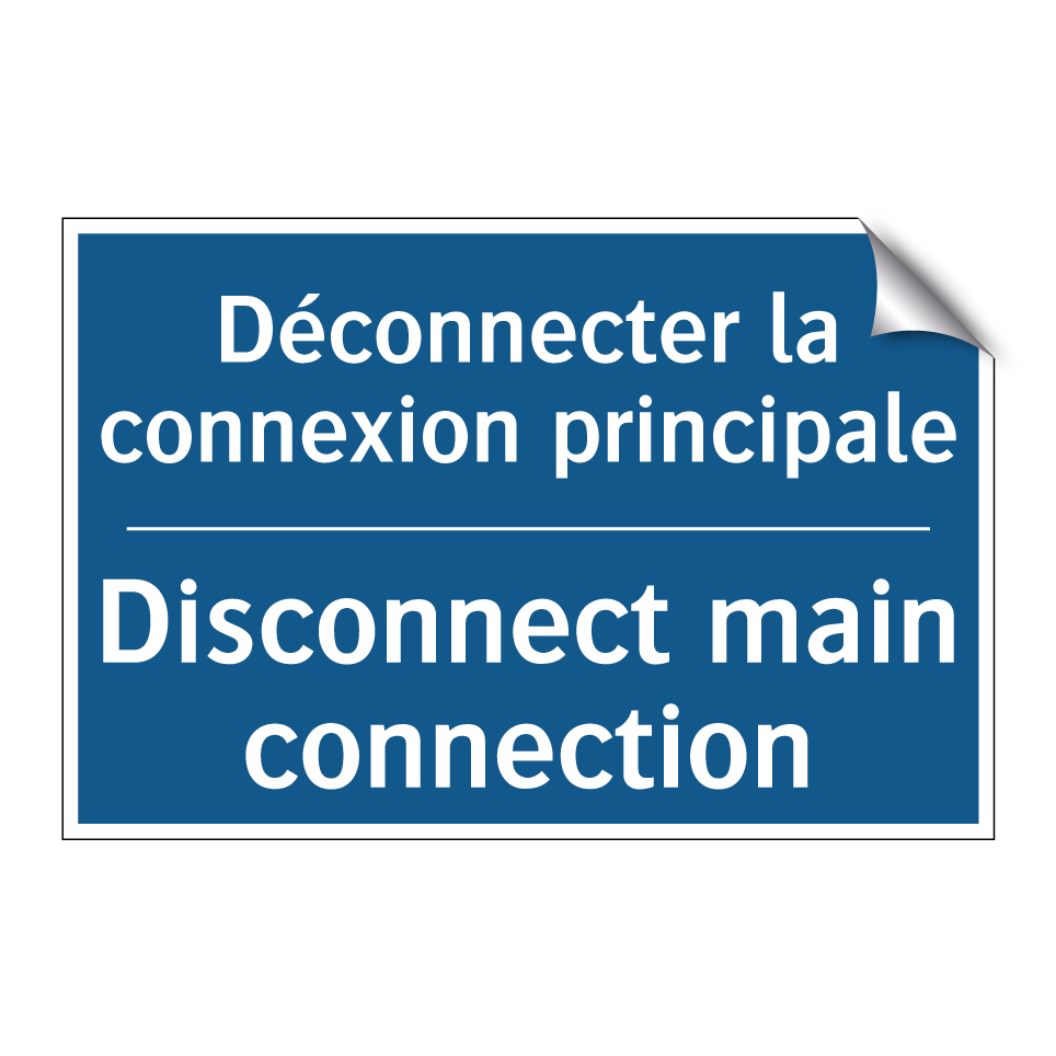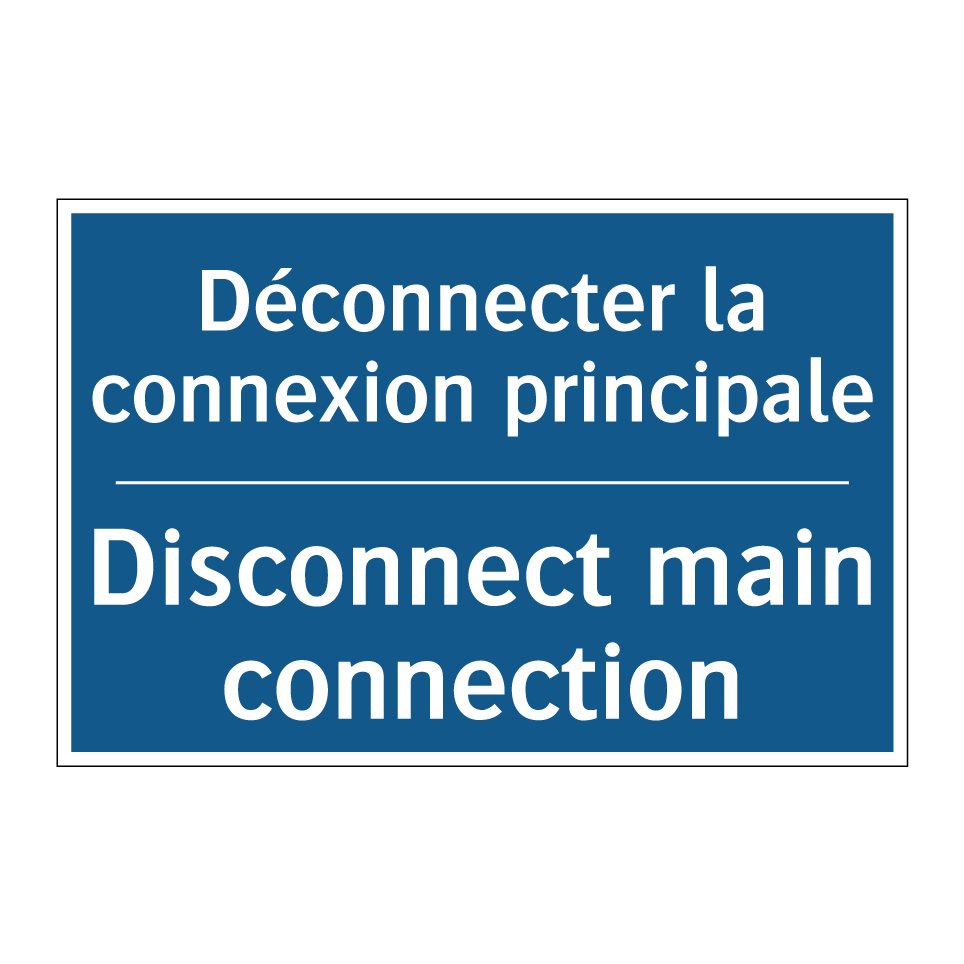 Panneau d'obligation bilingue avec texte en français : "Déconnecter la connexion principale", et en anglais : "Disconnect main connection"