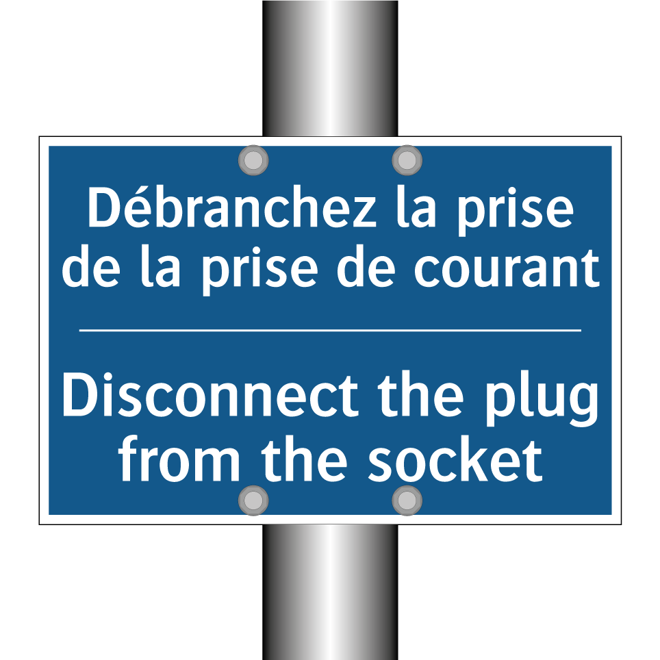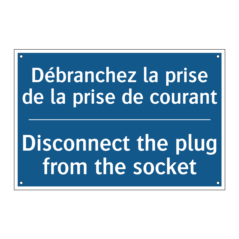 Panneau d'obligation bilingue avec texte en français : "Débranchez la prise de la prise de courant", et en anglais : "Disconnect the plug from the socket"