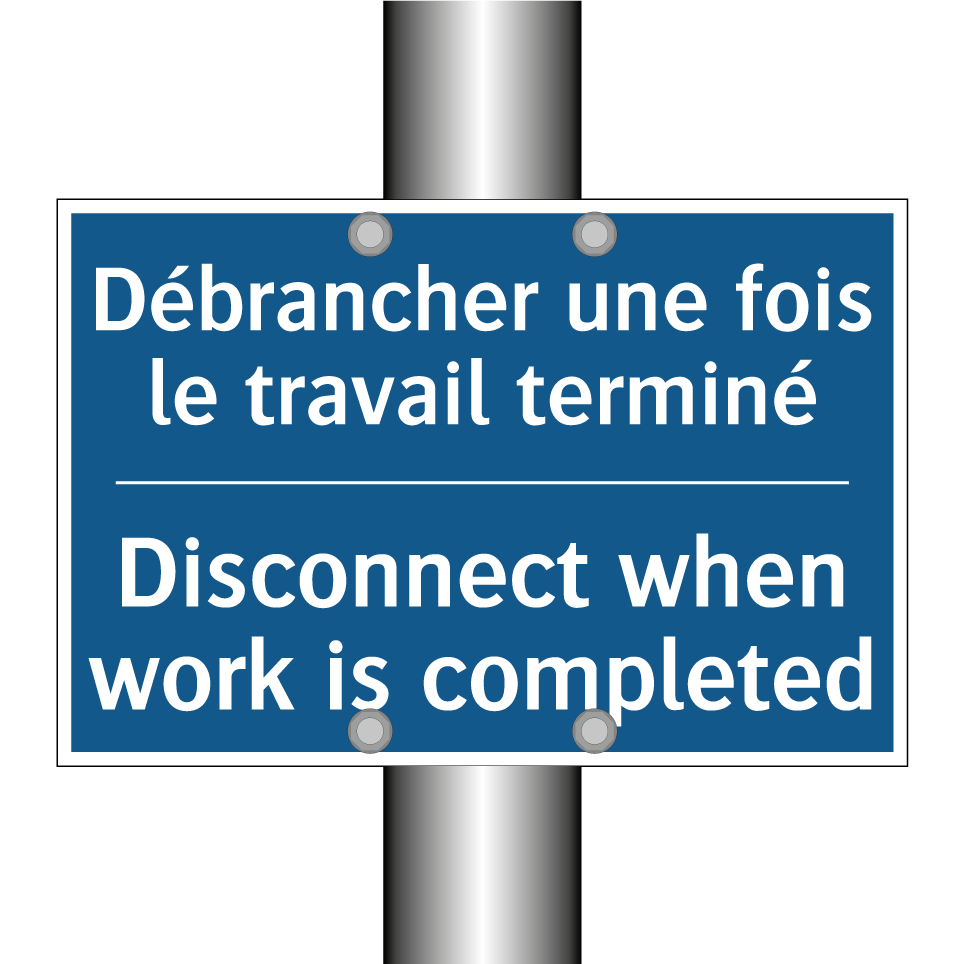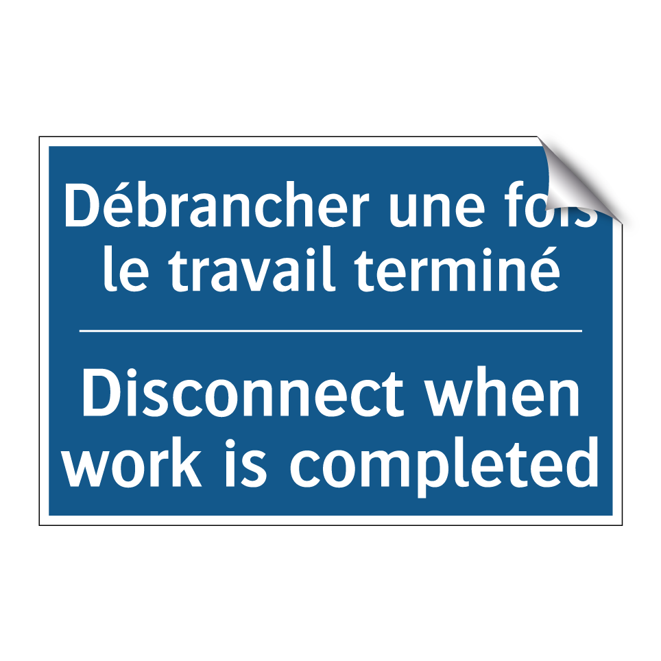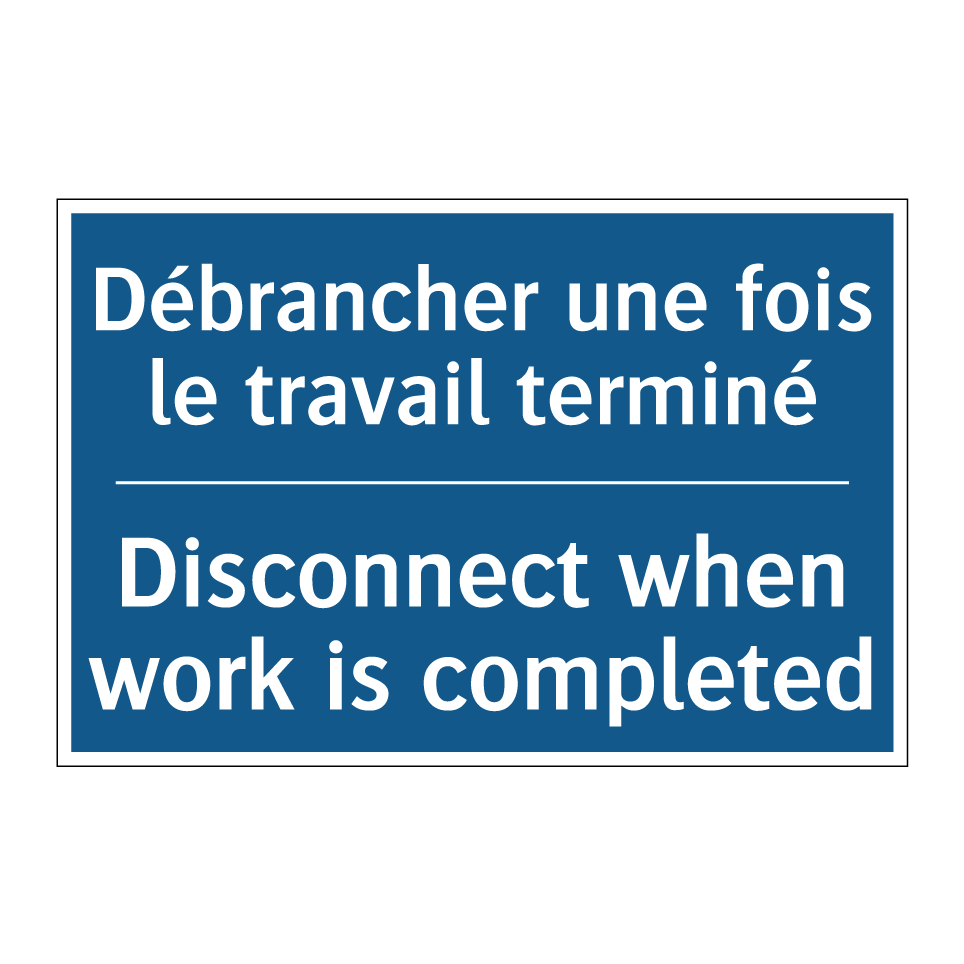 Panneau d'obligation bilingue avec texte en français : "Débrancher une fois le travail terminé", et en anglais : "Disconnect when work is completed"