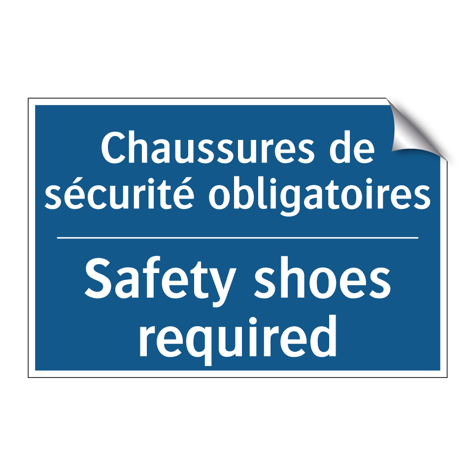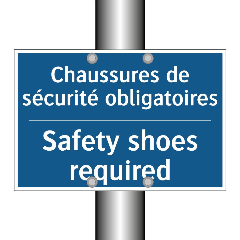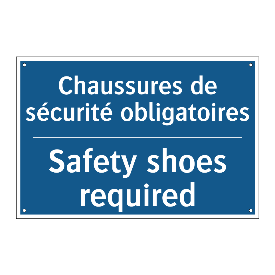 Panneau d'obligation bilingue avec texte en français : "Chaussures de sécurité obligatoires", et en anglais : "Safety shoes required"