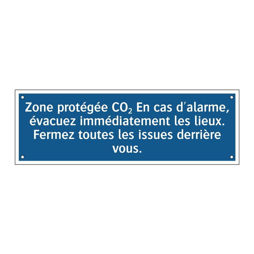 Panneau d'obligation avec le texte : "Zone protégée CO₂ En cas d'alarme, évacuez immédiatement les lieux. Fermez toutes les issues derrière vous."