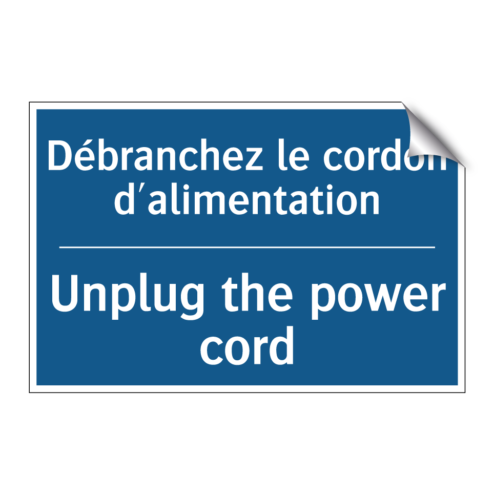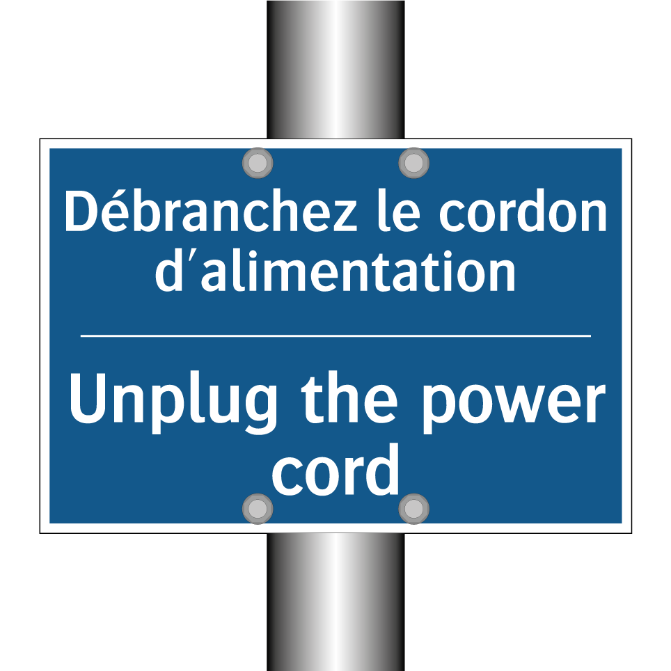 Panneau d'obligation bilingue avec texte en français : "Débranchez le cordon d'alimentation", et en anglais : "Unplug the power cord"