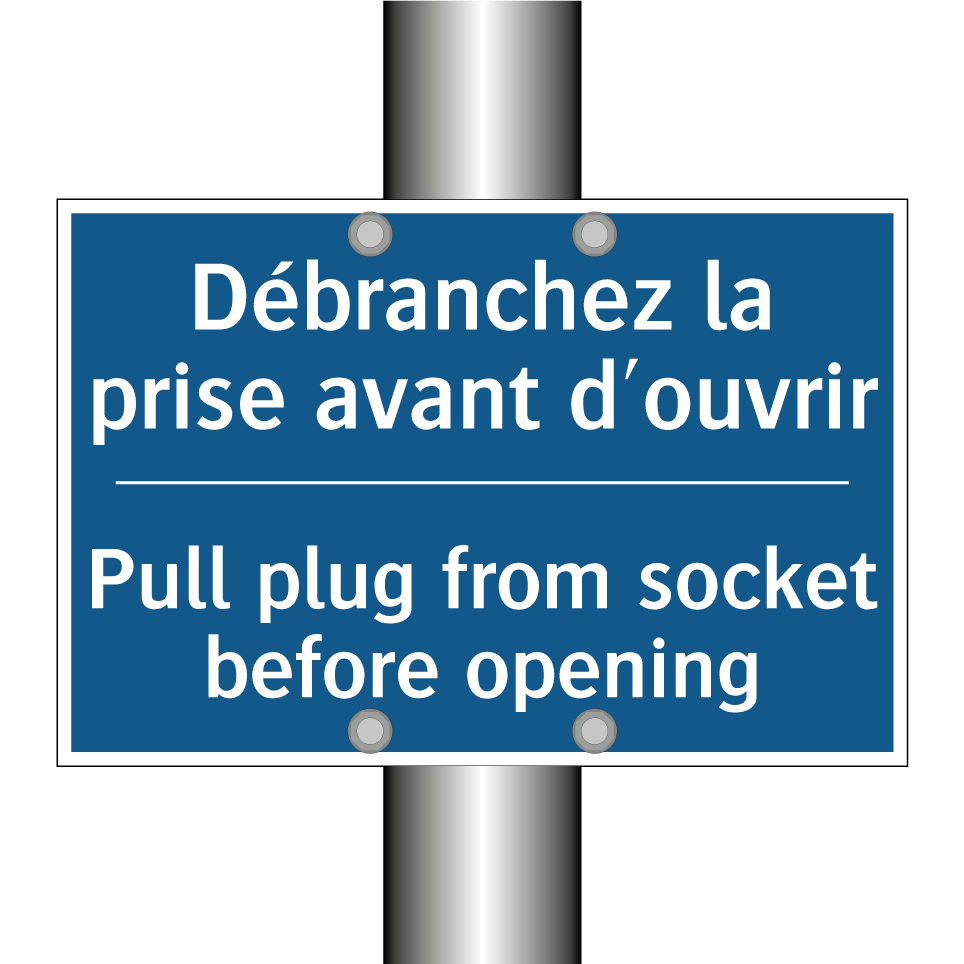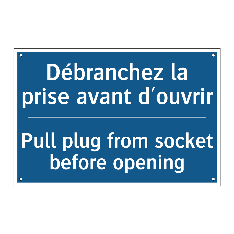 Panneau d'obligation bilingue avec texte en français : "Débranchez la prise avant d'ouvrir", et en anglais : "Pull plug from socket before opening"
