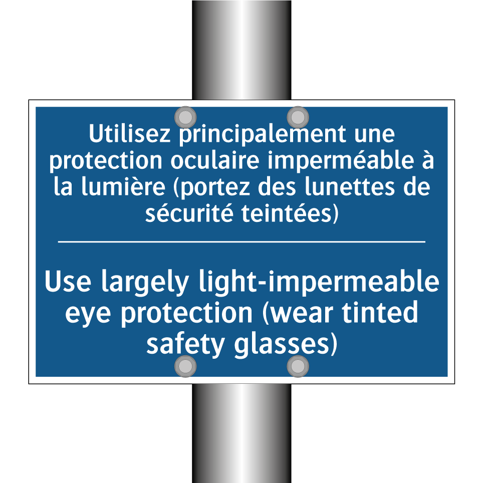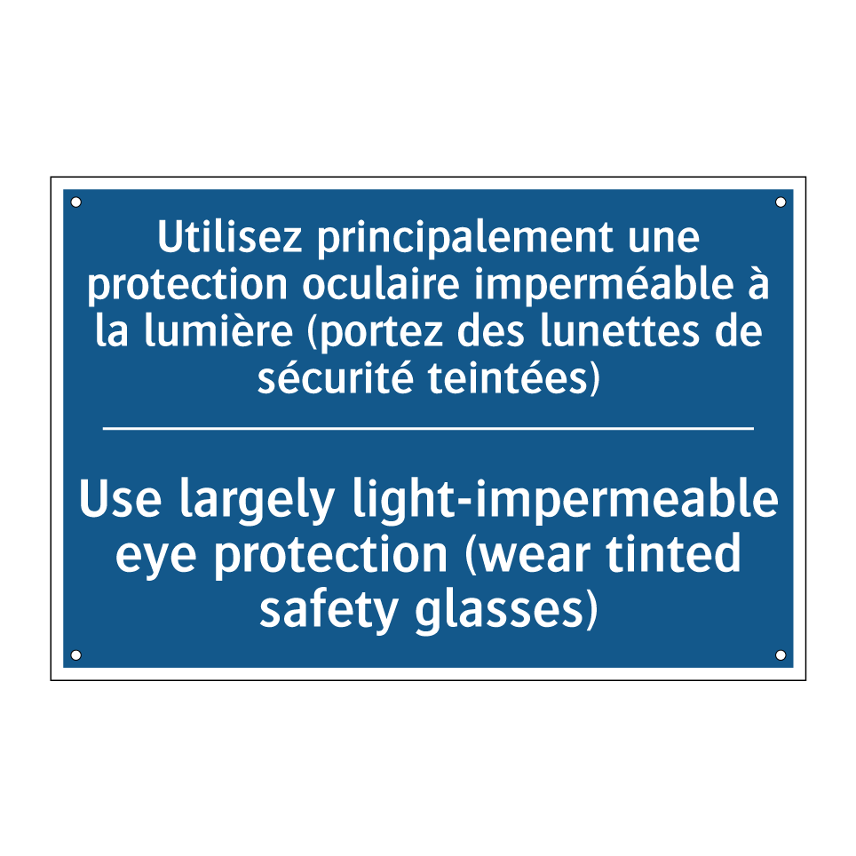Panneau d'obligation bilingue avec texte en français : "Utilisez principalement une protection oculaire imperméable à la lumière (portez des lunettes de sécurité teintées)", et en anglais : "Use largely light-impermeable eye protection (wear tinted safety glasses)"