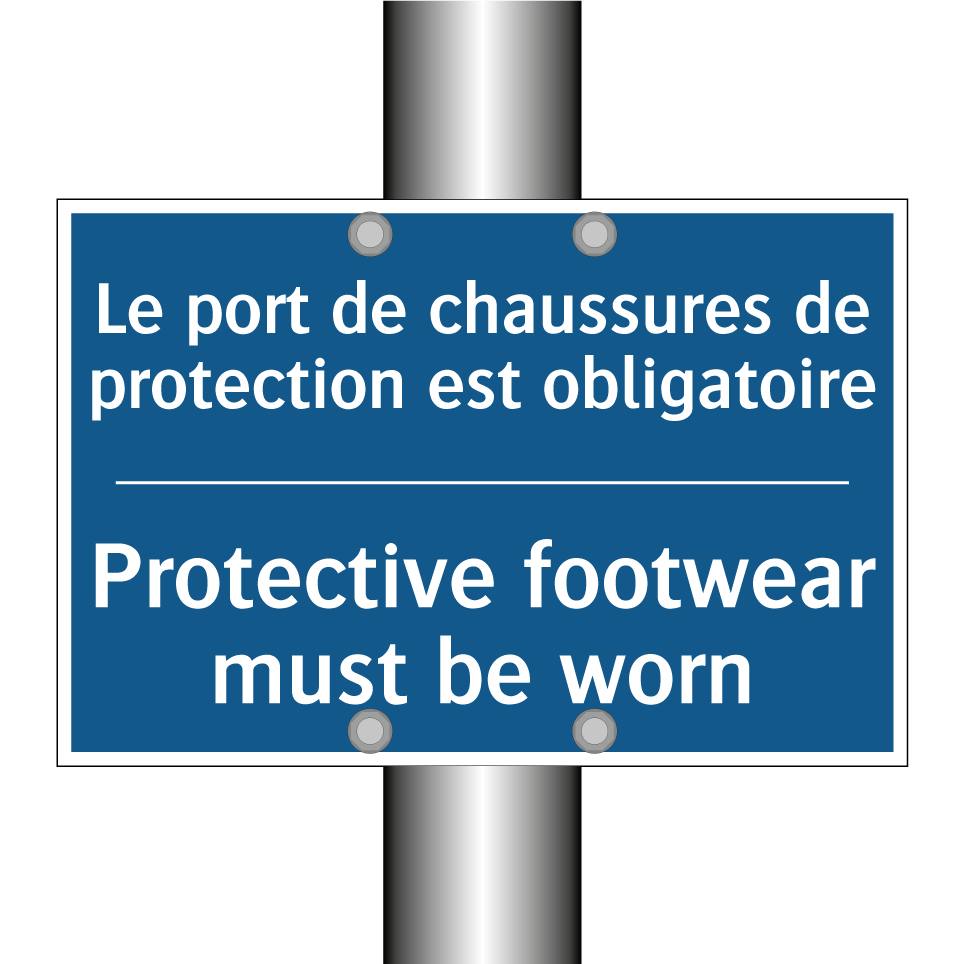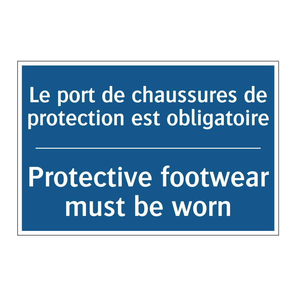 Panneau d'obligation bilingue avec texte en français : "Le port de chaussures de protection est obligatoire", et en anglais : "Protective footwear must be worn"