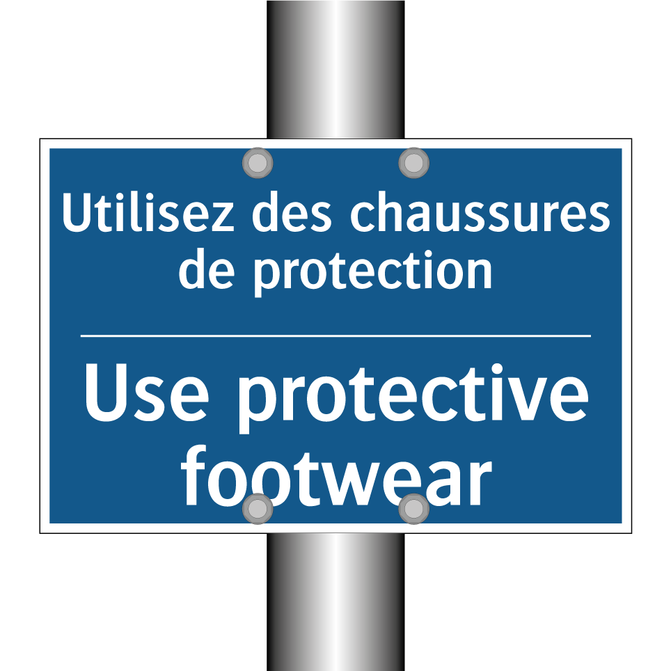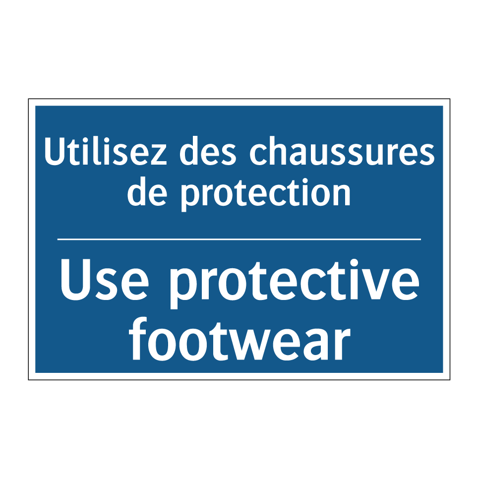 Panneau d'obligation bilingue avec texte en français : "Utilisez des chaussures de protection", et en anglais : "Use protective footwear"