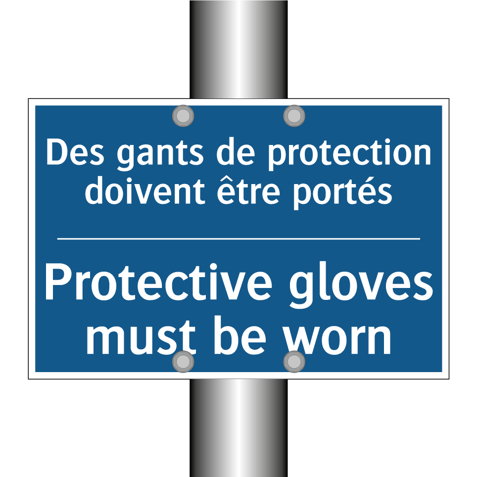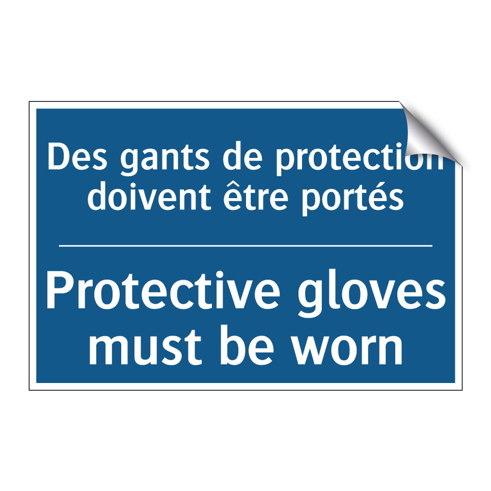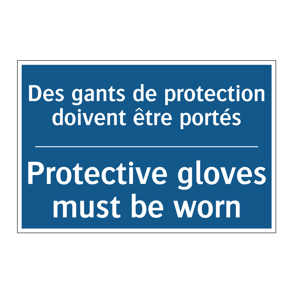 Panneau d'obligation bilingue avec texte en français : "Des gants de protection doivent être portés", et en anglais : "Protective gloves must be worn"