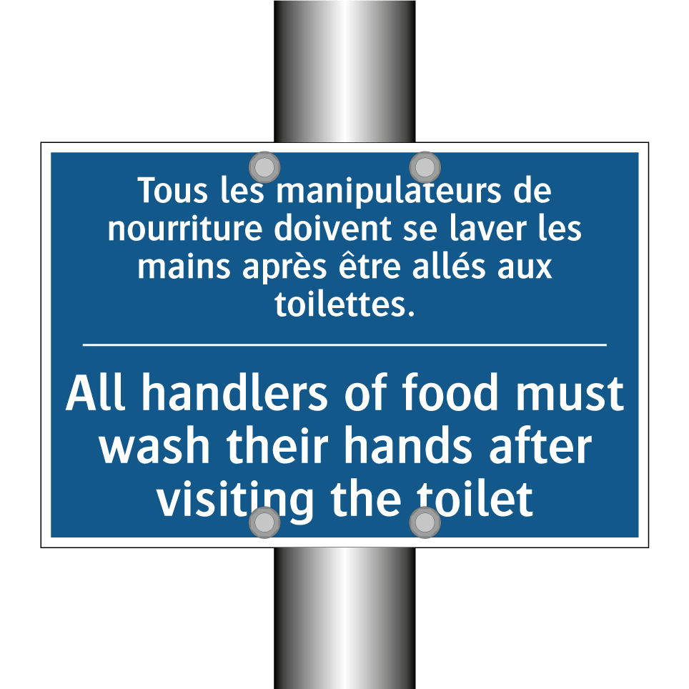 Panneau d'obligation bilingue avec texte en français : "Tous les manipulateurs de nourriture doivent se laver les mains après être allés aux toilettes.", et en anglais : "All handlers of food must wash their hands after visiting the toilet"