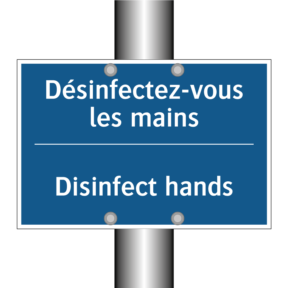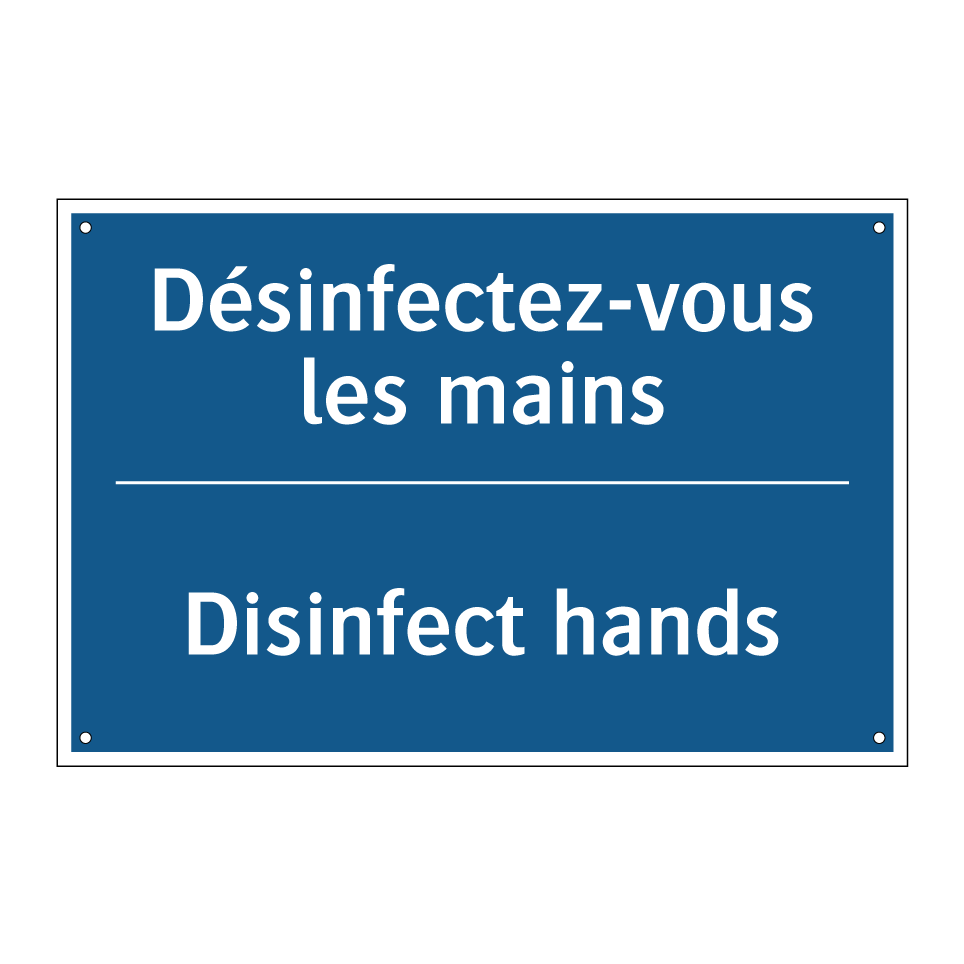 Panneau d'obligation bilingue avec texte en français : "Désinfectez-vous les mains", et en anglais : "Disinfect hands"