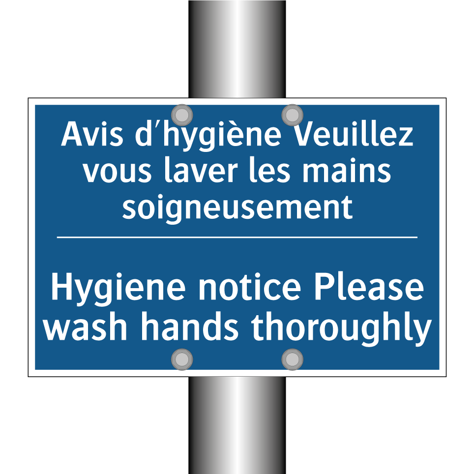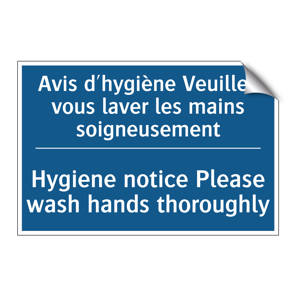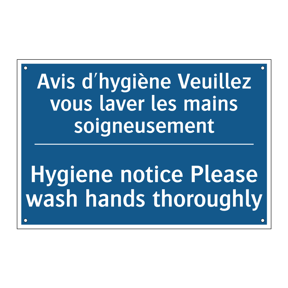 Panneau d'obligation bilingue avec texte en français : "Avis d'hygiène Veuillez vous laver les mains soigneusement", et en anglais : "Hygiene notice Please wash hands thoroughly"