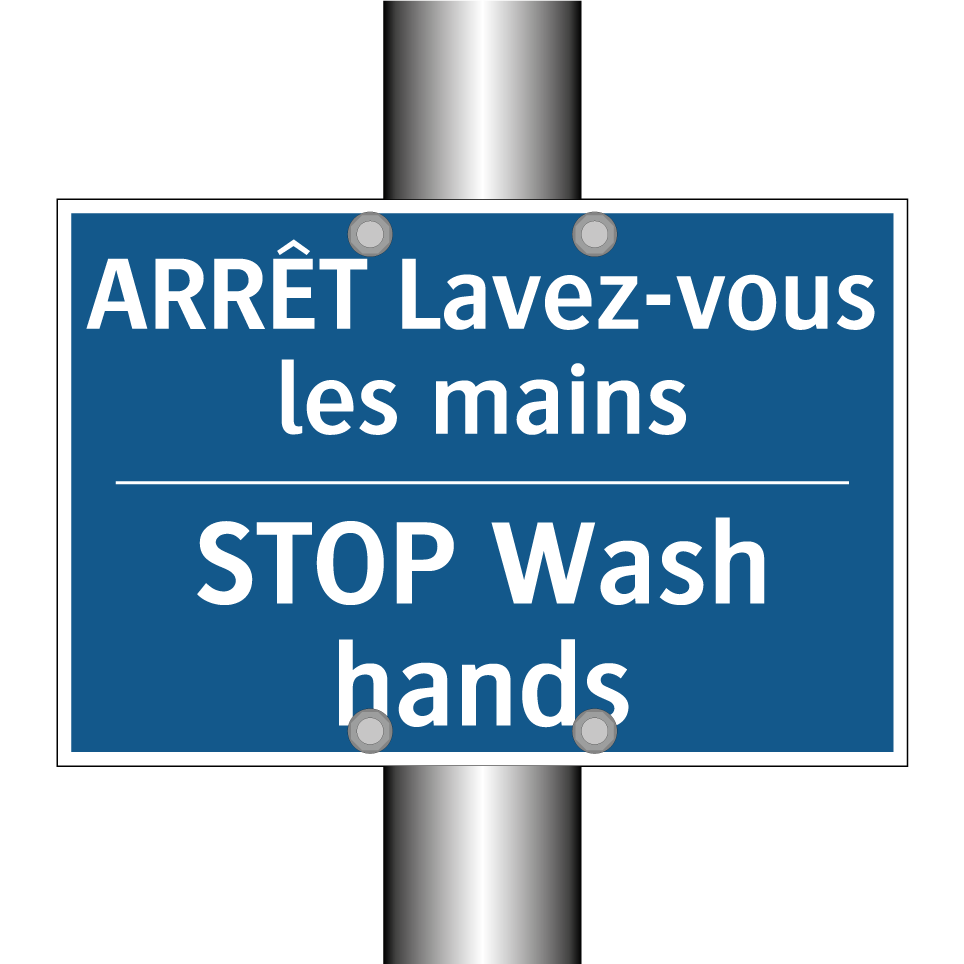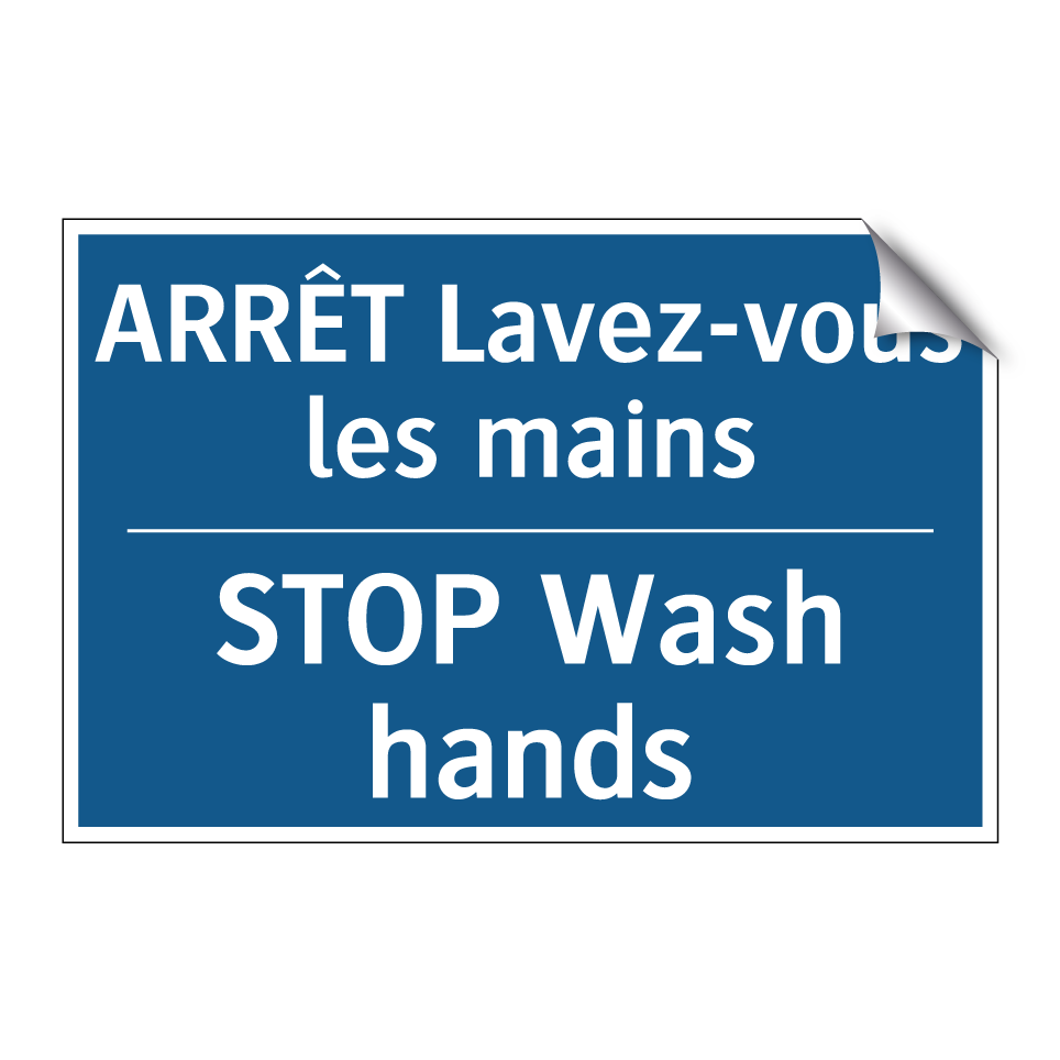 Panneau d'obligation bilingue avec texte en français : "ARRÊT Lavez-vous les mains", et en anglais : "STOP Wash hands"