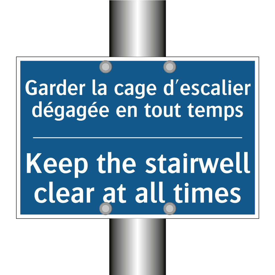 Panneau d'obligation bilingue avec texte en français : "Garder la cage d'escalier dégagée en tout temps", et en anglais : "Keep the stairwell clear at all times"