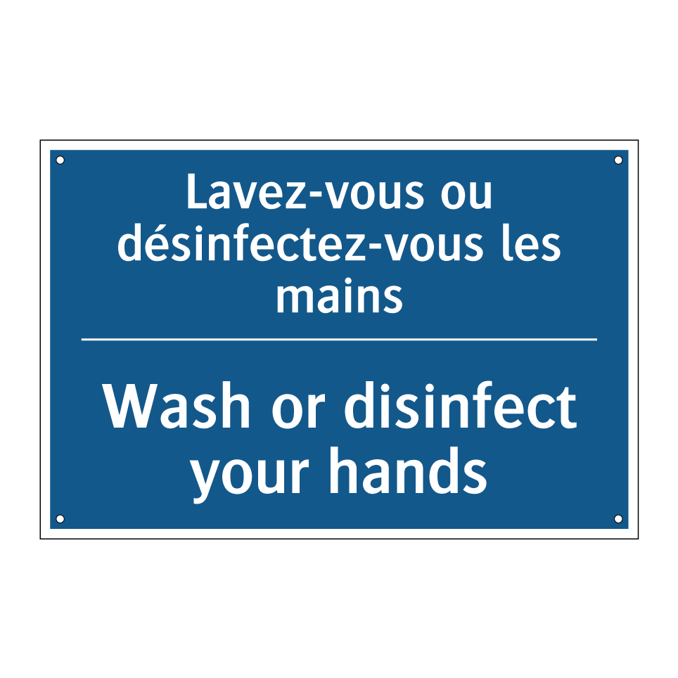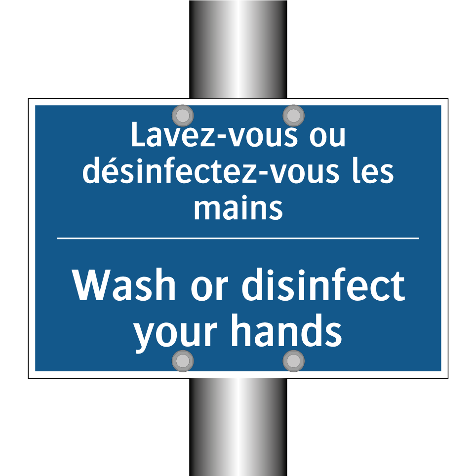 Panneau d'obligation bilingue avec texte en français : "Lavez-vous ou désinfectez-vous les mains", et en anglais : "Wash or disinfect your hands"