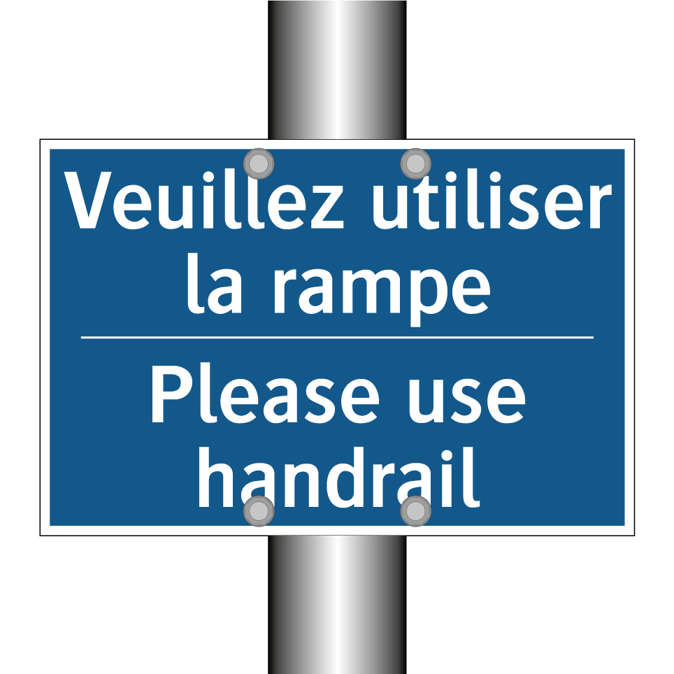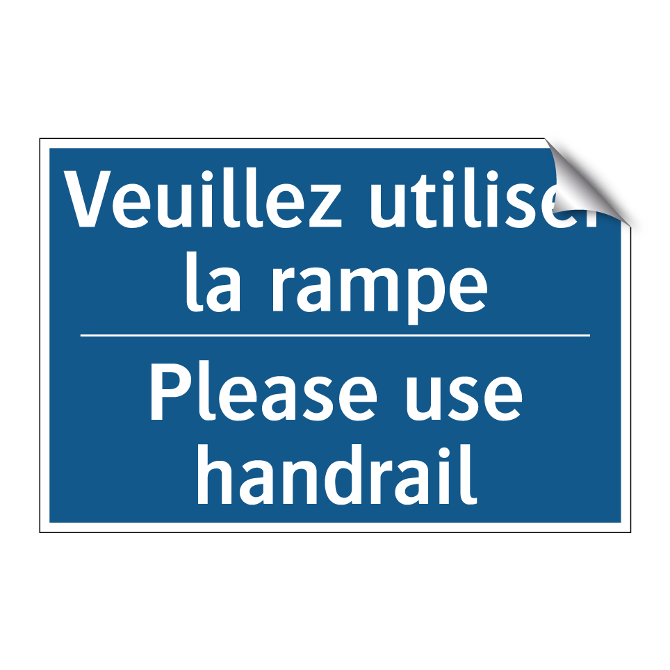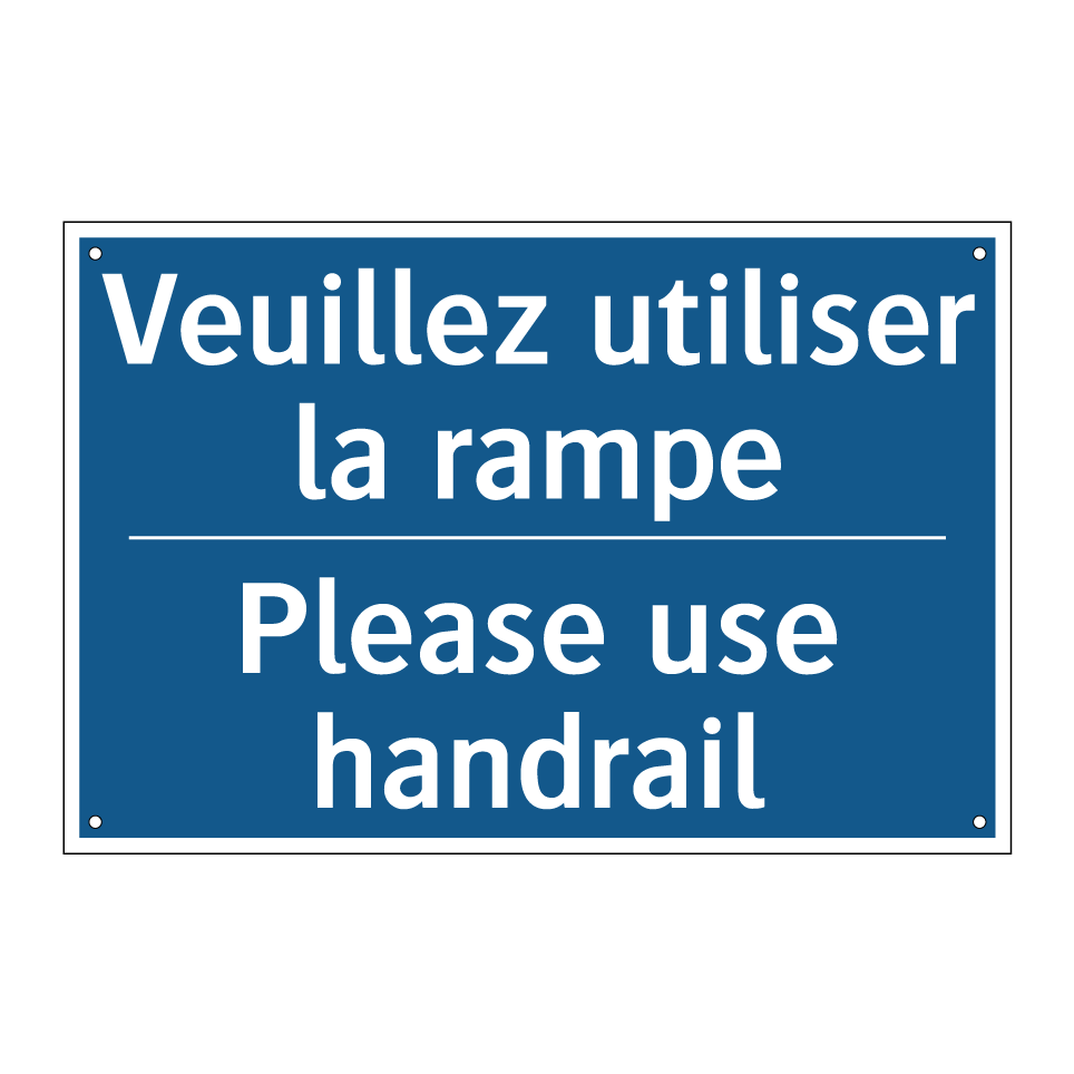 Panneau d'obligation bilingue avec texte en français : "Veuillez utiliser la rampe", et en anglais : "Please use handrail"