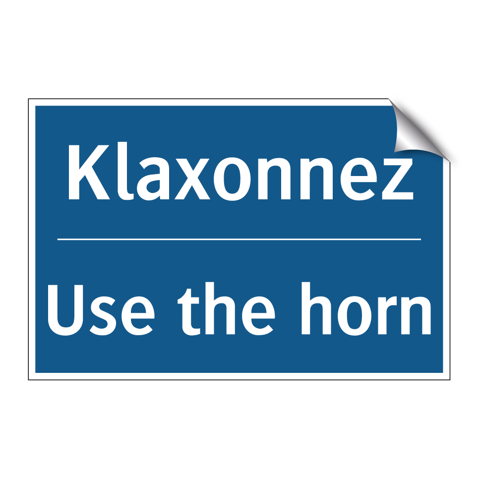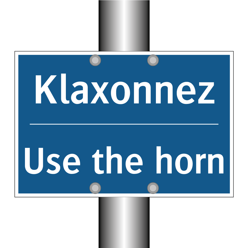 Panneau d'obligation bilingue avec texte en français : "Klaxonnez", et en anglais : "Use the horn"