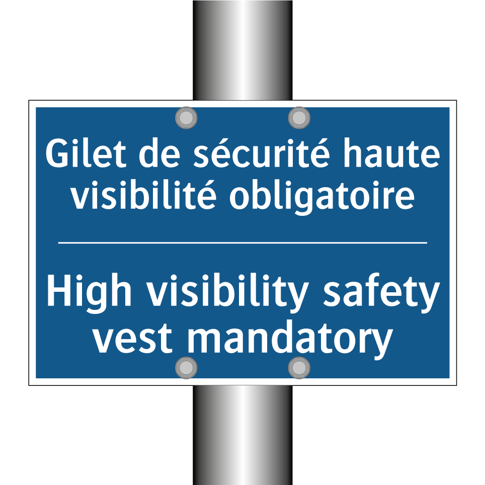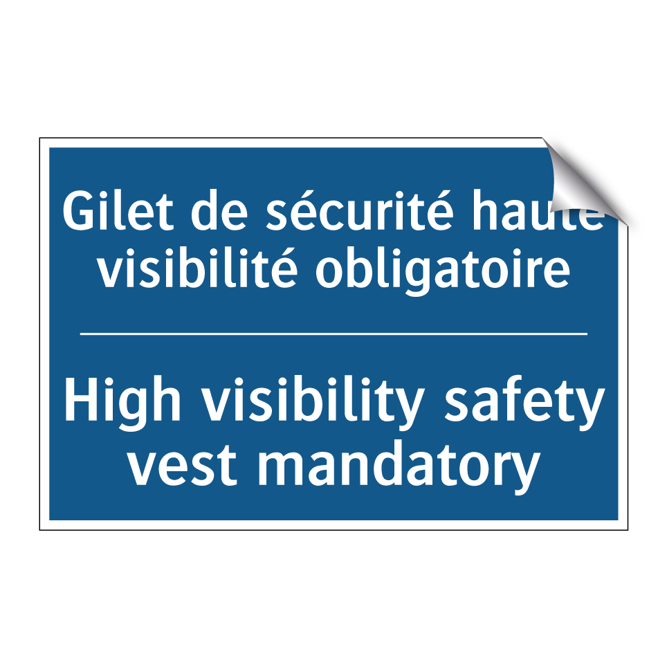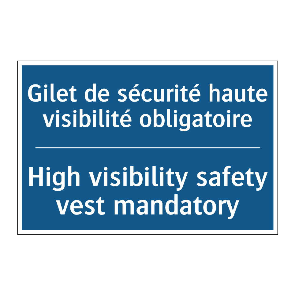 Panneau d'obligation bilingue avec texte en français : "Gilet de sécurité haute visibilité obligatoire", et en anglais : "High visibility safety vest mandatory"
