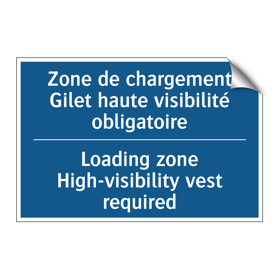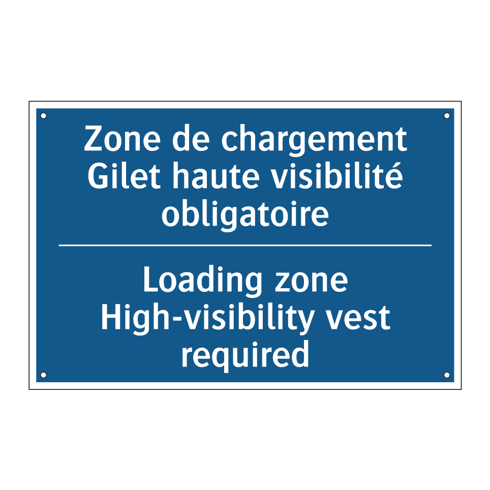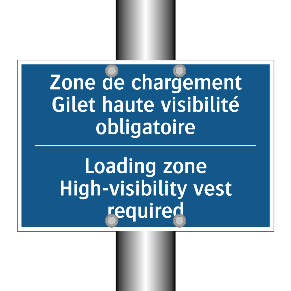 Panneau d'obligation bilingue avec texte en français : "Zone de chargement Gilet haute visibilité obligatoire", et en anglais : "Loading zone High-visibility vest required"