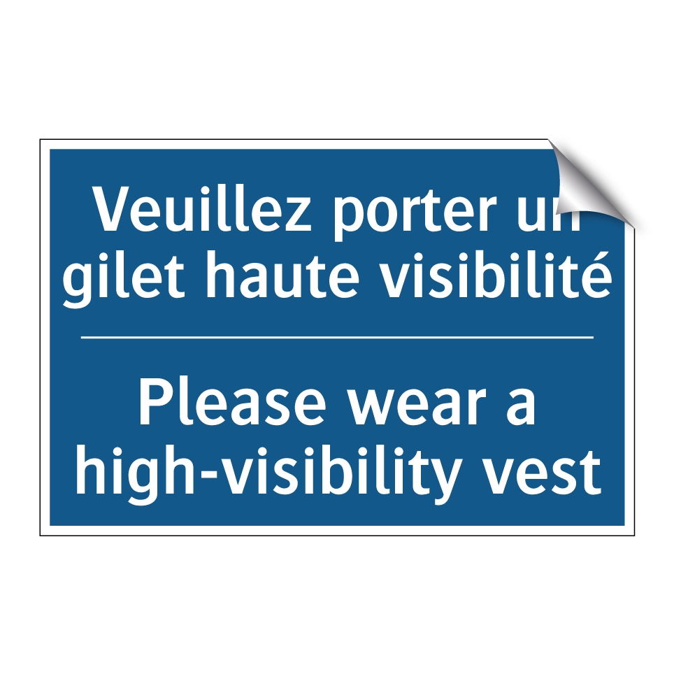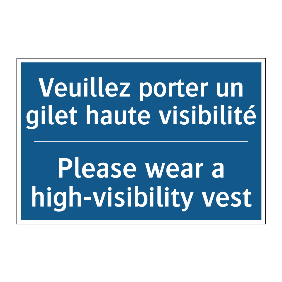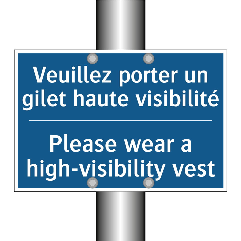 Panneau d'obligation bilingue avec texte en français : "Veuillez porter un gilet haute visibilité", et en anglais : "Please wear a high-visibility vest"