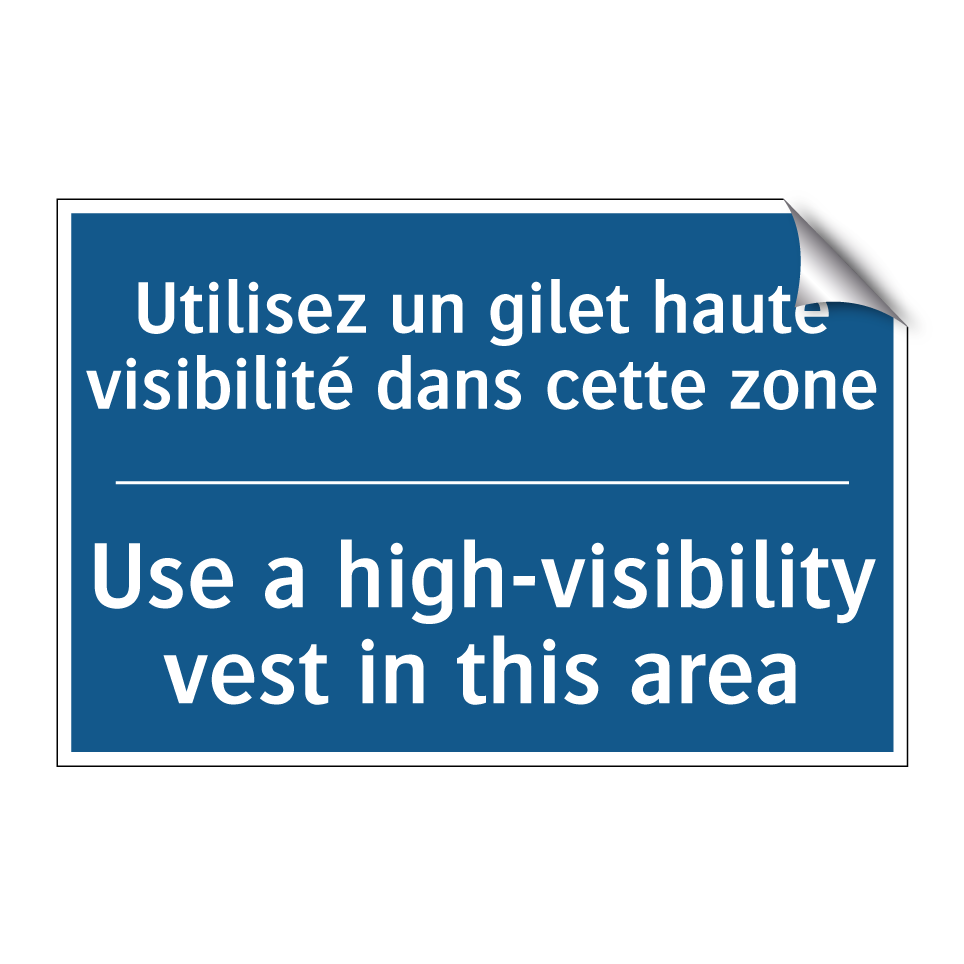Panneau d'obligation bilingue avec texte en français : "Utilisez un gilet haute visibilité dans cette zone", et en anglais : "Use a high-visibility vest in this area"