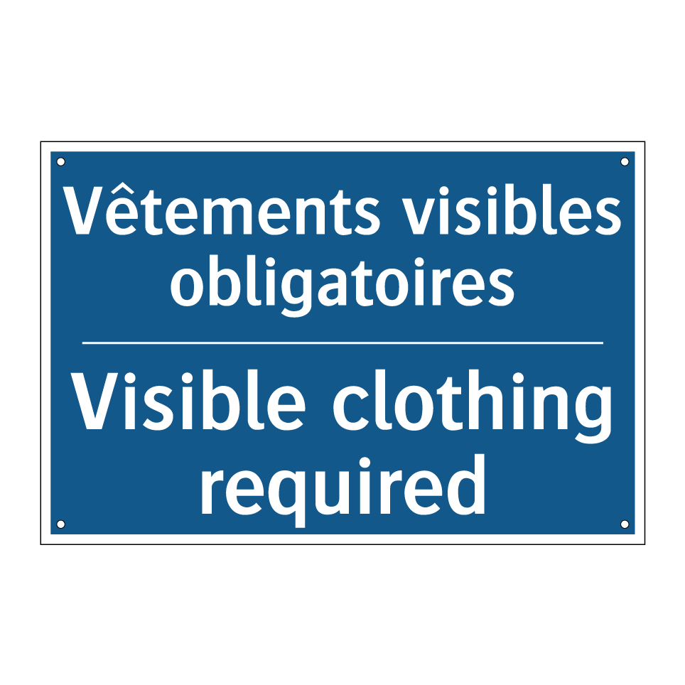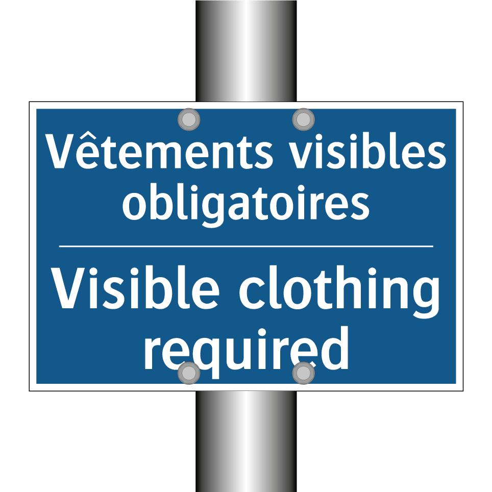 Panneau d'obligation bilingue avec texte en français : "Vêtements visibles obligatoires", et en anglais : "Visible clothing required"