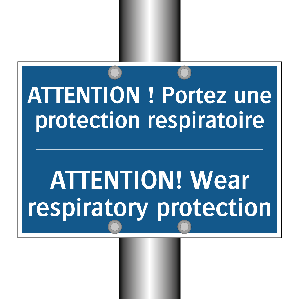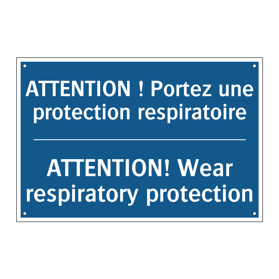 Panneau d'obligation bilingue avec texte en français : "ATTENTION ! Portez une protection respiratoire", et en anglais : "ATTENTION! Wear respiratory protection"