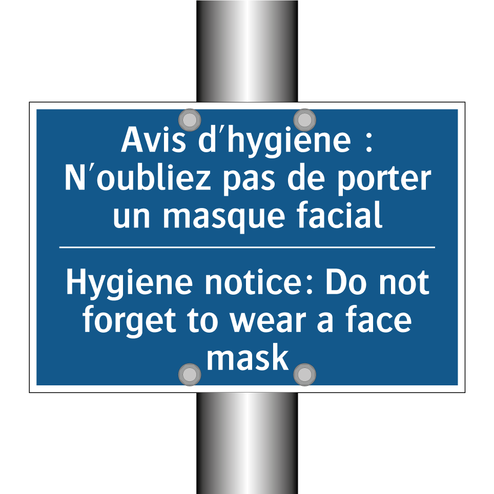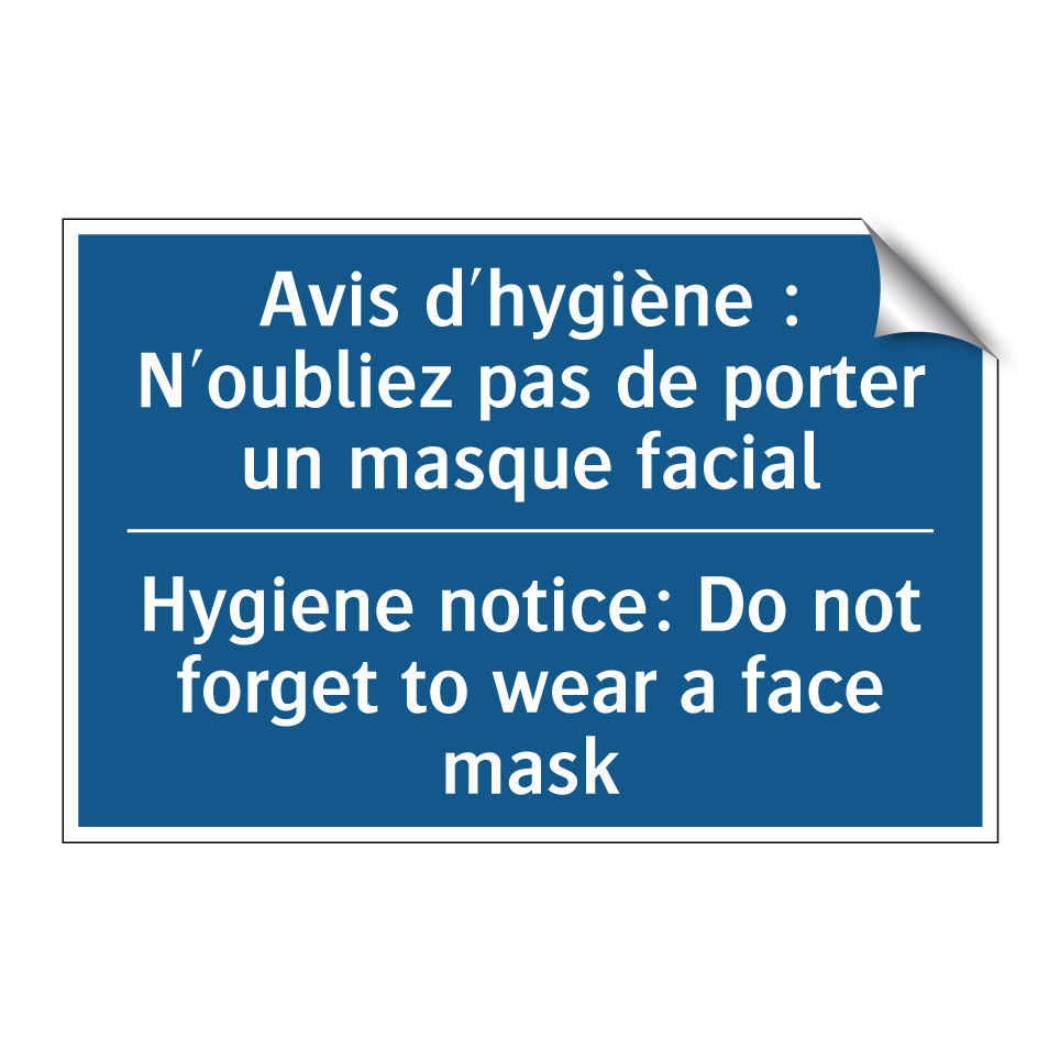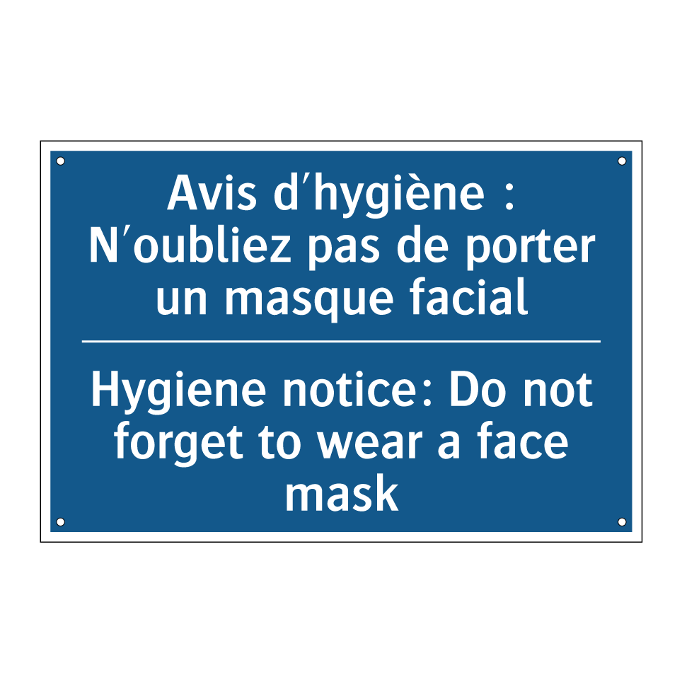Panneau d'obligation bilingue avec texte en français : "Avis d'hygiène : N'oubliez pas de porter un masque facial", et en anglais : "Hygiene notice: Do not forget to wear a face mask"