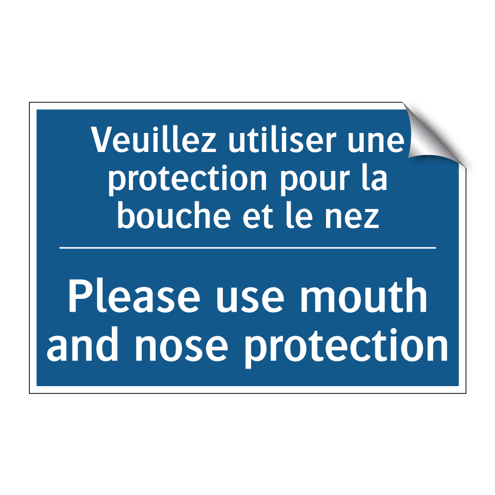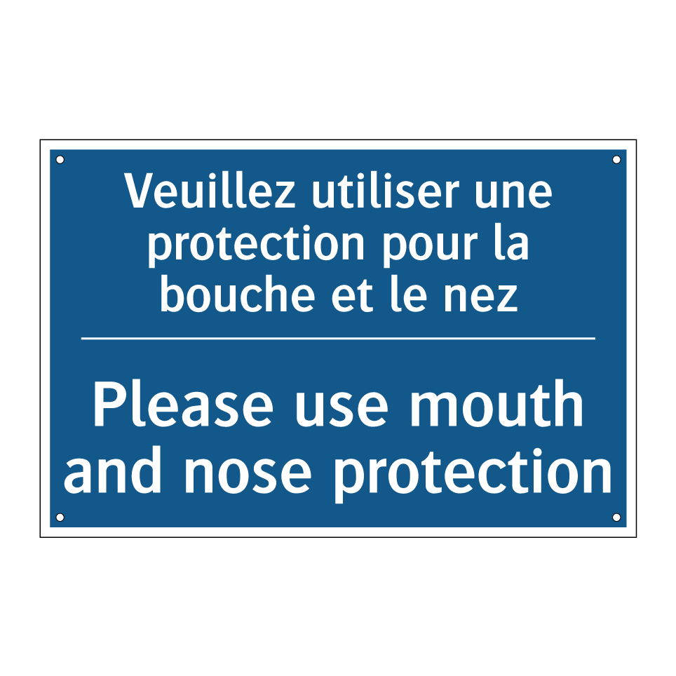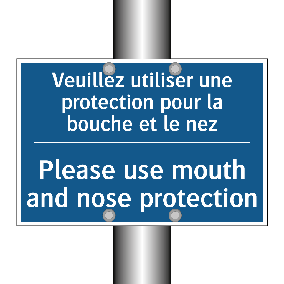 Panneau d'obligation bilingue avec texte en français : "Veuillez utiliser une protection pour la bouche et le nez", et en anglais : "Please use mouth and nose protection"