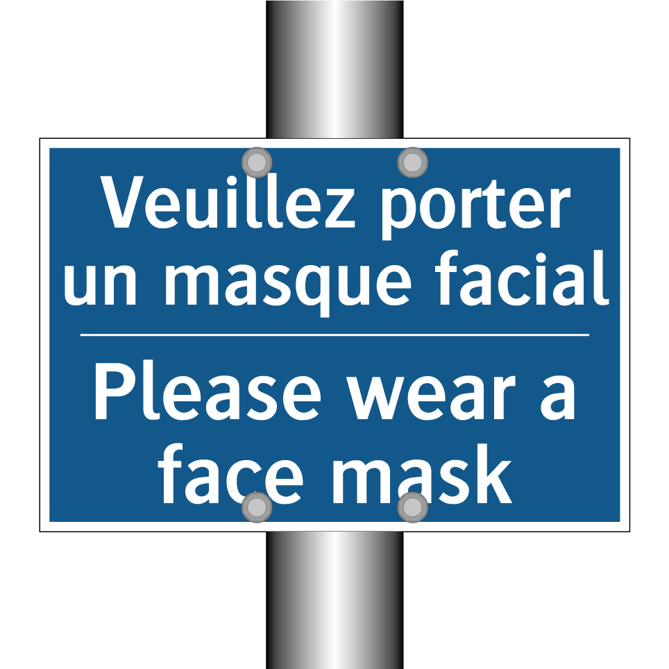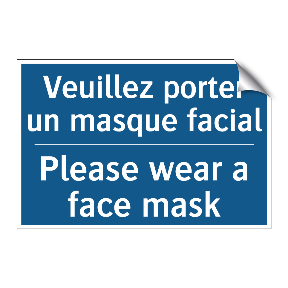 Panneau d'obligation bilingue avec texte en français : "Veuillez porter un masque facial", et en anglais : "Please wear a face mask"
