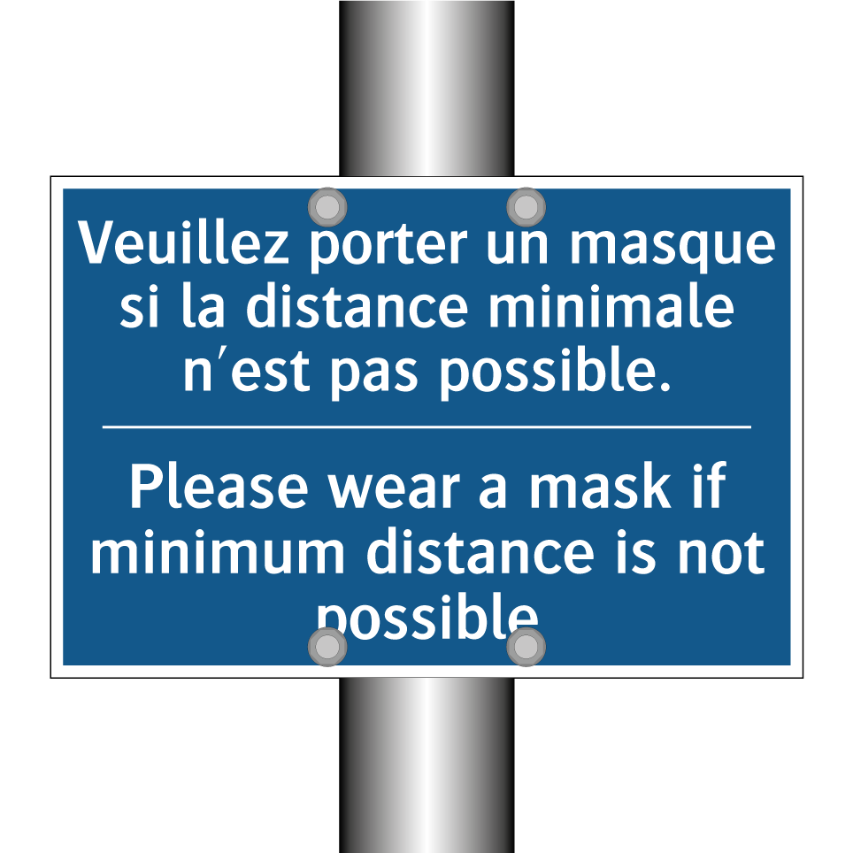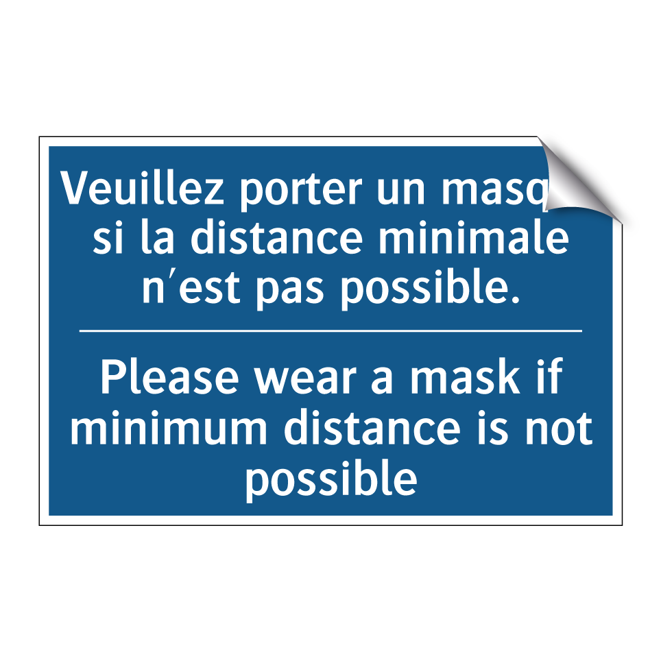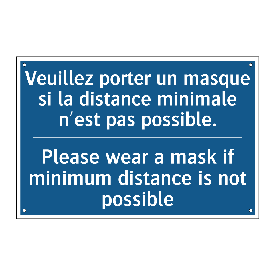 Panneau d'obligation bilingue avec texte en français : "Veuillez porter un masque si la distance minimale n'est pas possible.", et en anglais : "Please wear a mask if minimum distance is not possible"