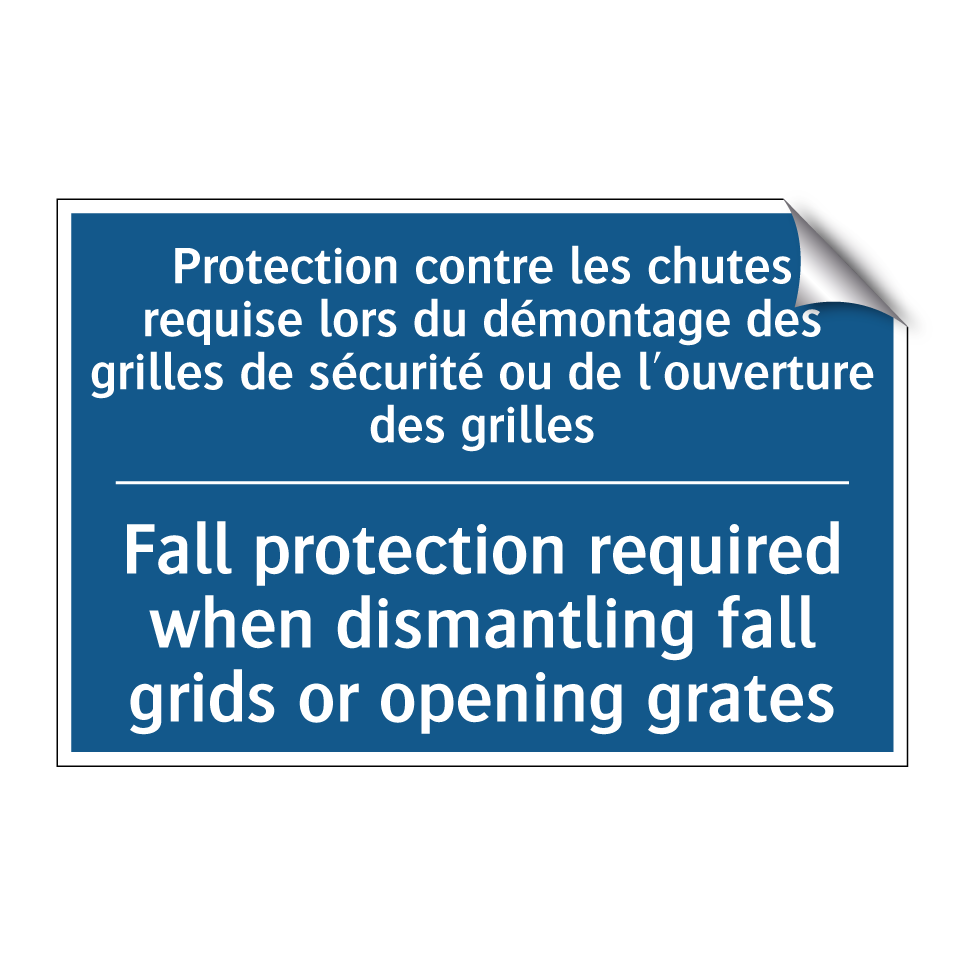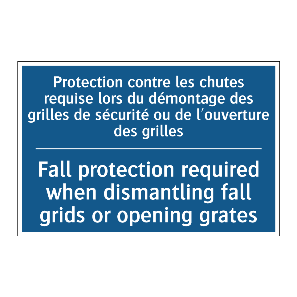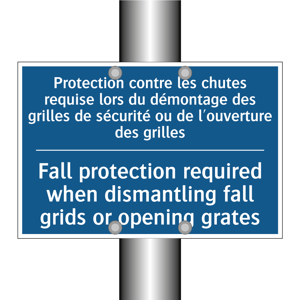 Panneau d'obligation bilingue avec texte en français : "Protection contre les chutes requise lors du démontage des grilles de sécurité ou de l'ouverture des grilles", et en anglais : "Fall protection required when dismantling fall grids or opening grates"