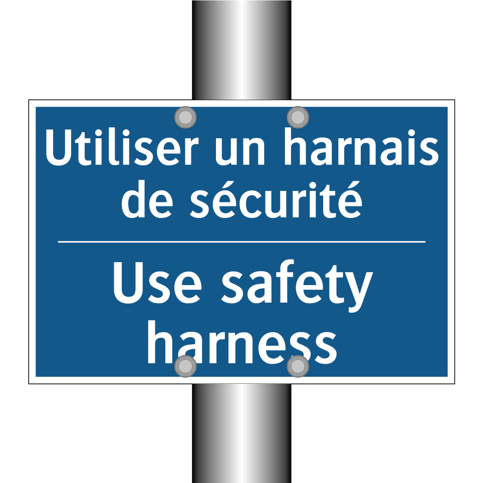 Panneau d'obligation bilingue avec texte en français : "Utiliser un harnais de sécurité", et en anglais : "Use safety harness"