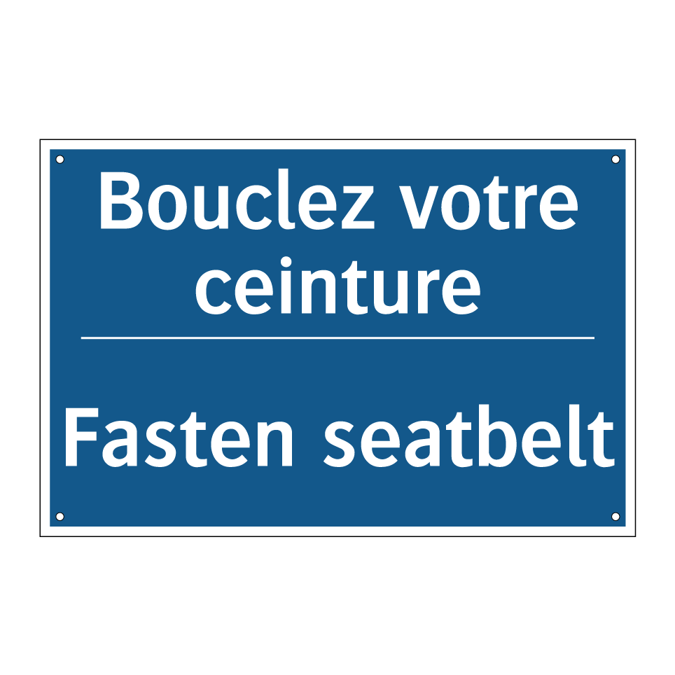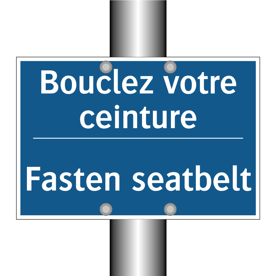 Panneau d'obligation bilingue avec texte en français : "Bouclez votre ceinture", et en anglais : "Fasten seatbelt"