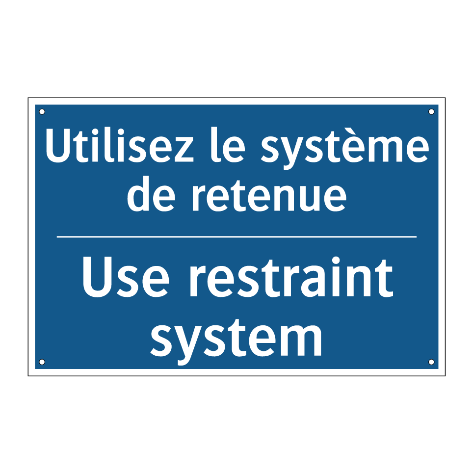Panneau d'obligation bilingue avec texte en français : "Utilisez le système de retenue", et en anglais : "Use restraint system"
