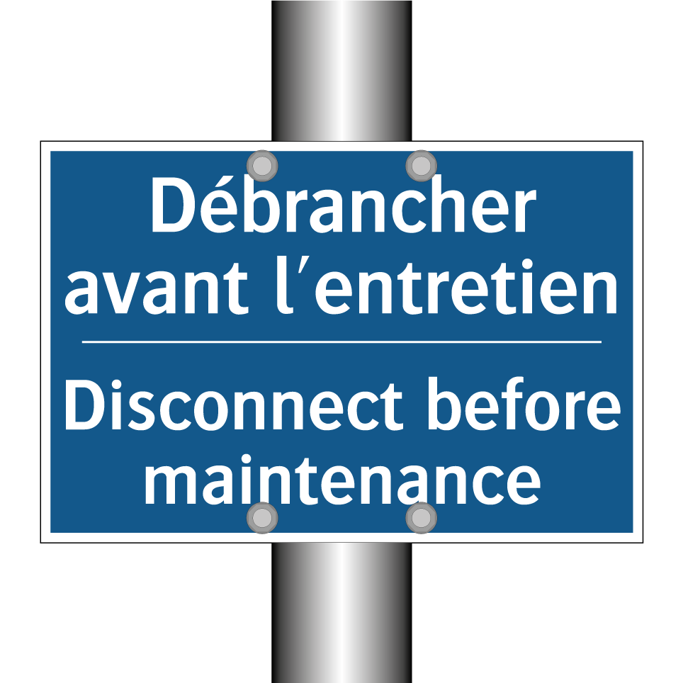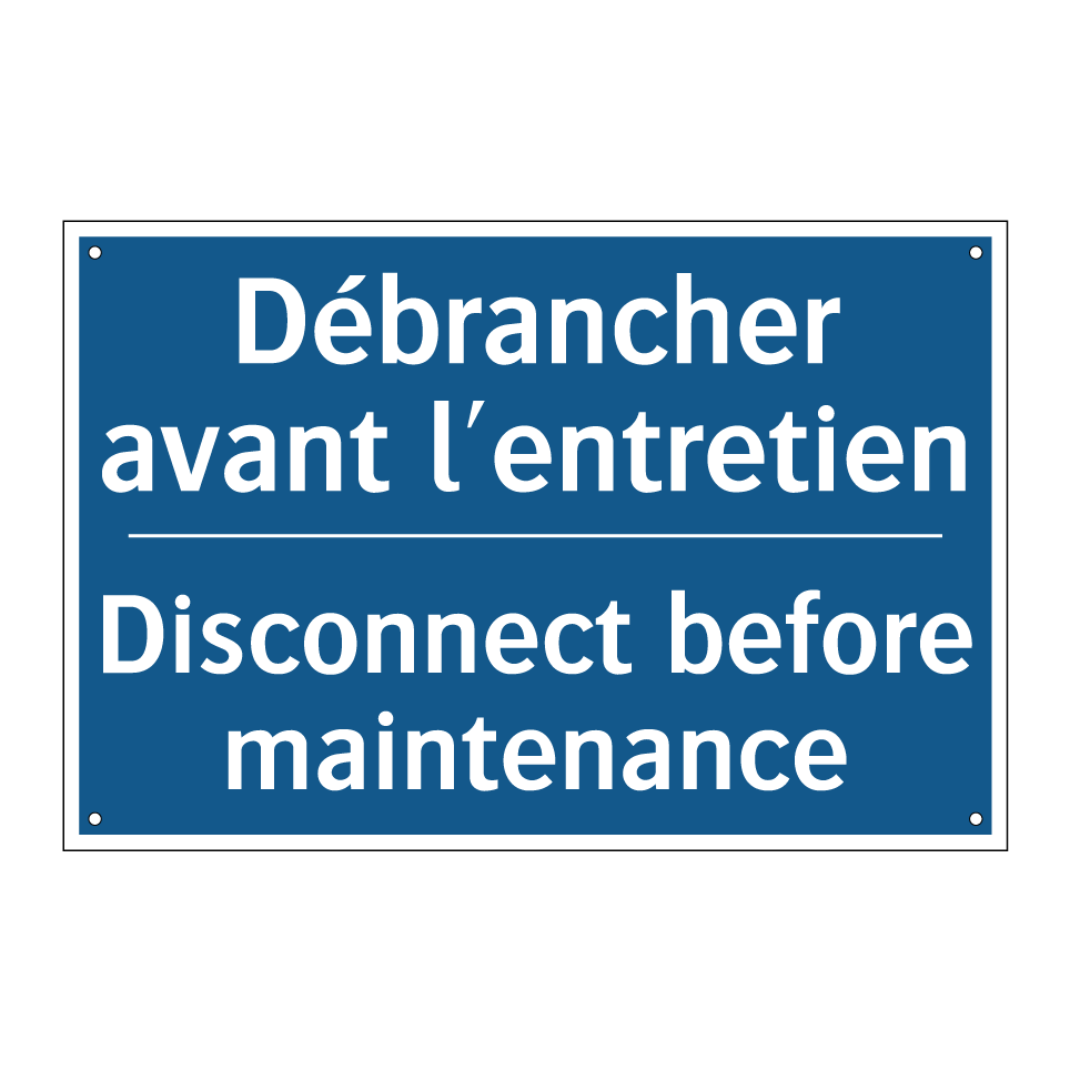 Panneau d'obligation bilingue avec texte en français : "Débrancher avant l'entretien", et en anglais : "Disconnect before maintenance"