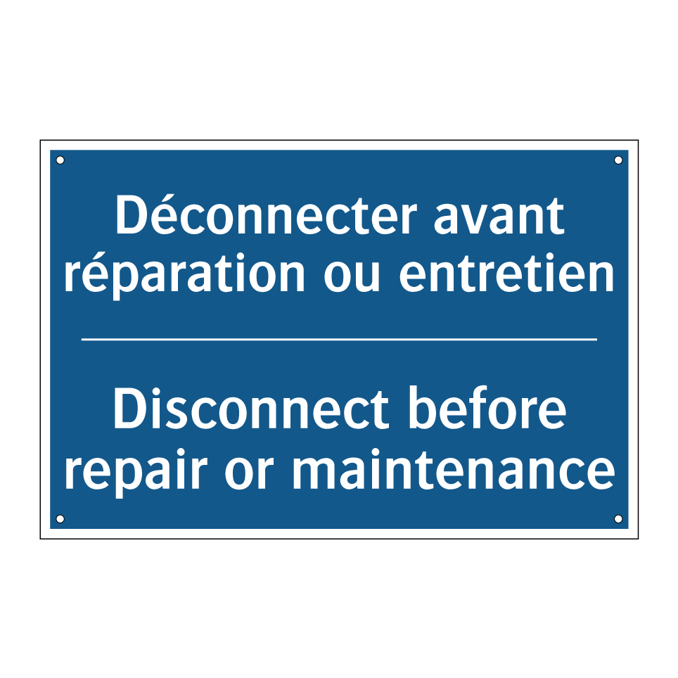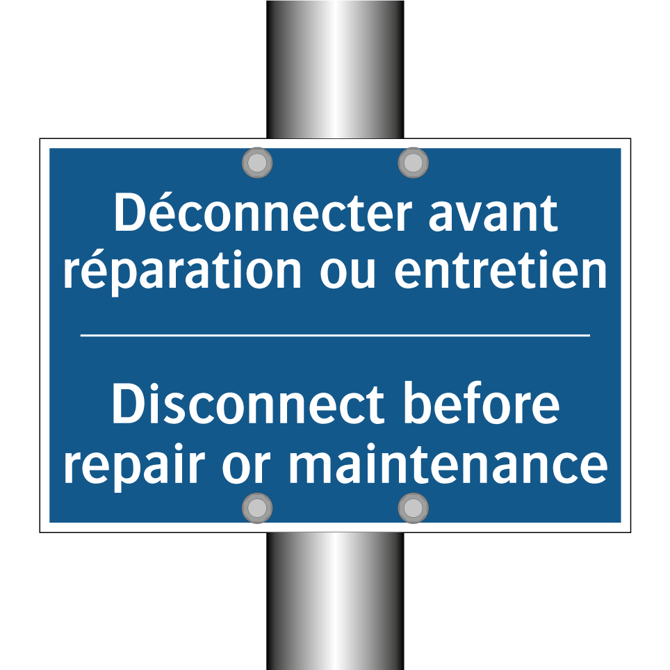 Panneau d'obligation bilingue avec texte en français : "Déconnecter avant réparation ou entretien", et en anglais : "Disconnect before repair or maintenance"