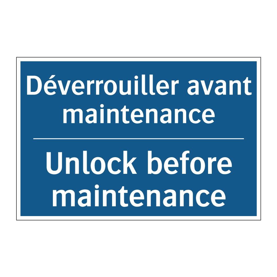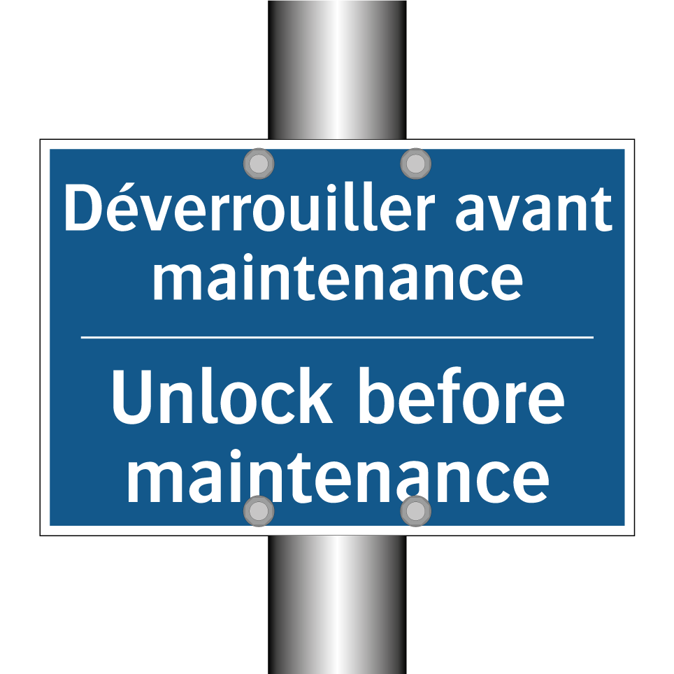 Panneau d'obligation bilingue avec texte en français : "Déverrouiller avant maintenance", et en anglais : "Unlock before maintenance"
