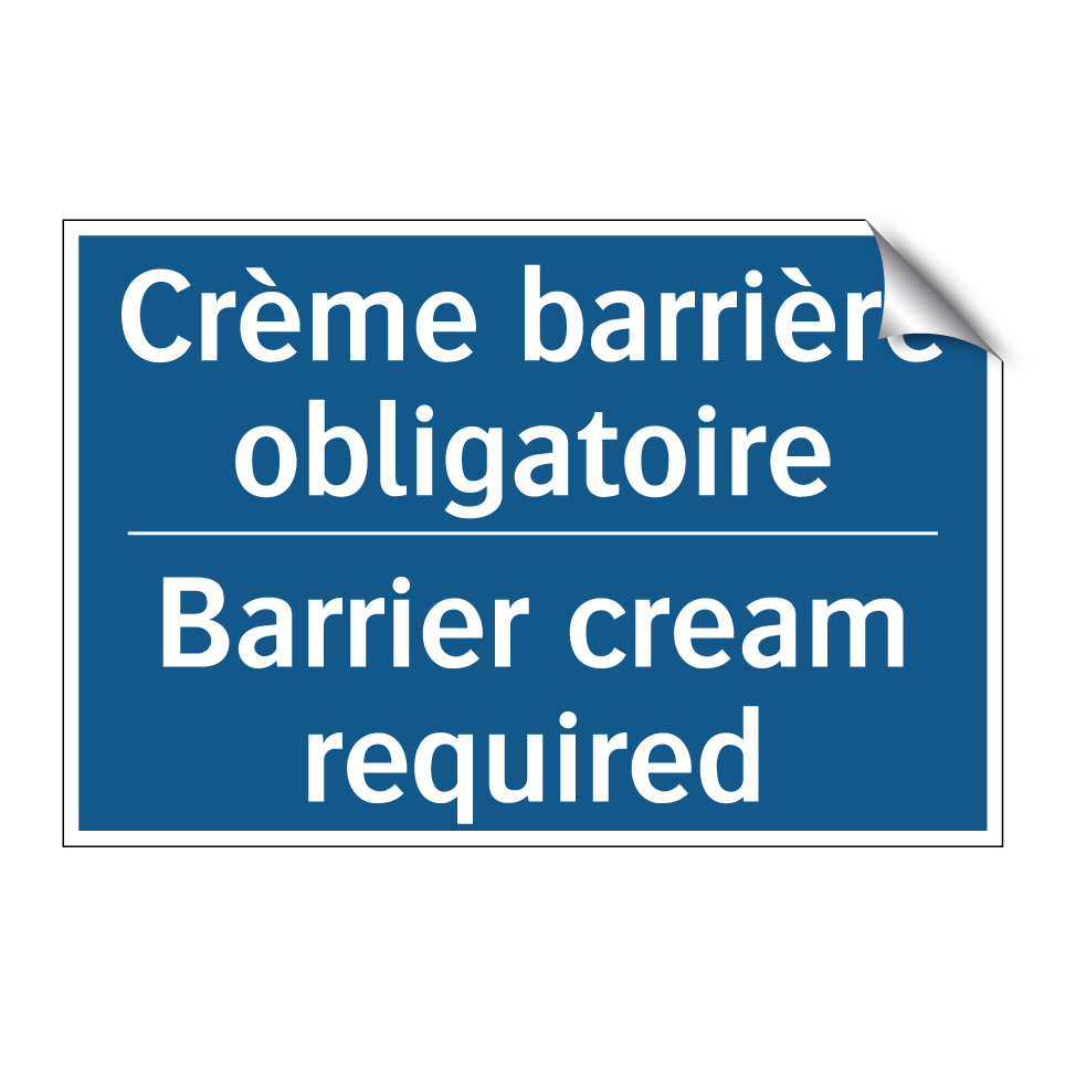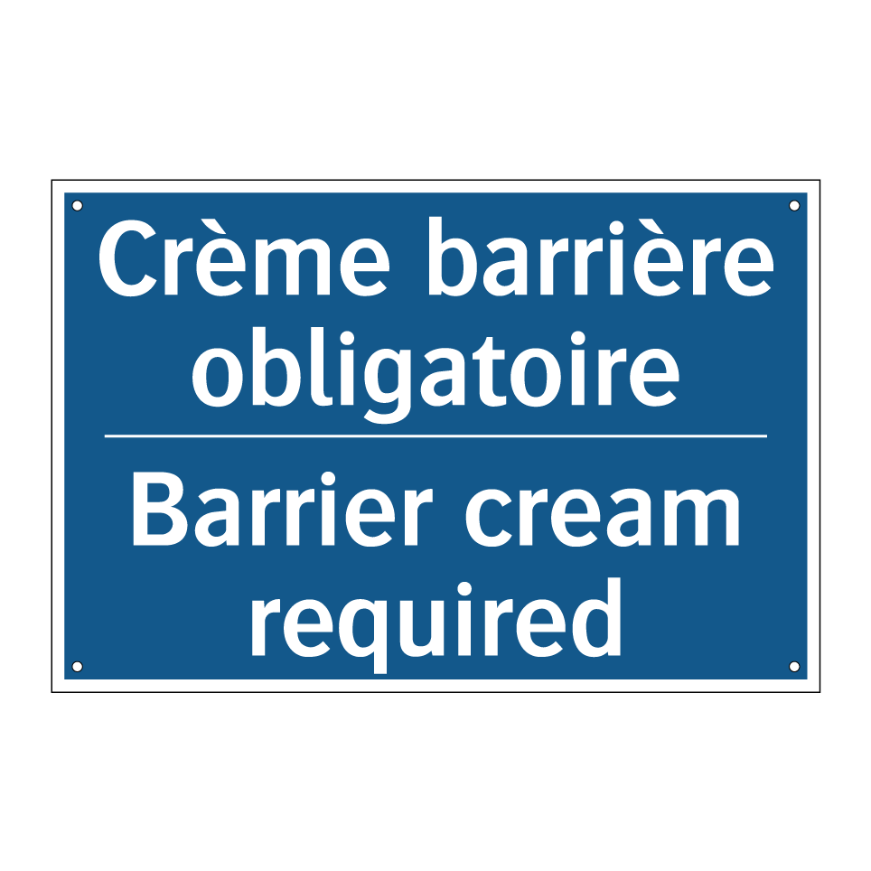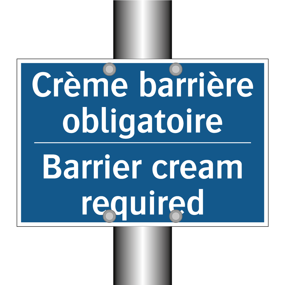 Panneau d'obligation bilingue avec texte en français : "Crème barrière obligatoire", et en anglais : "Barrier cream required"